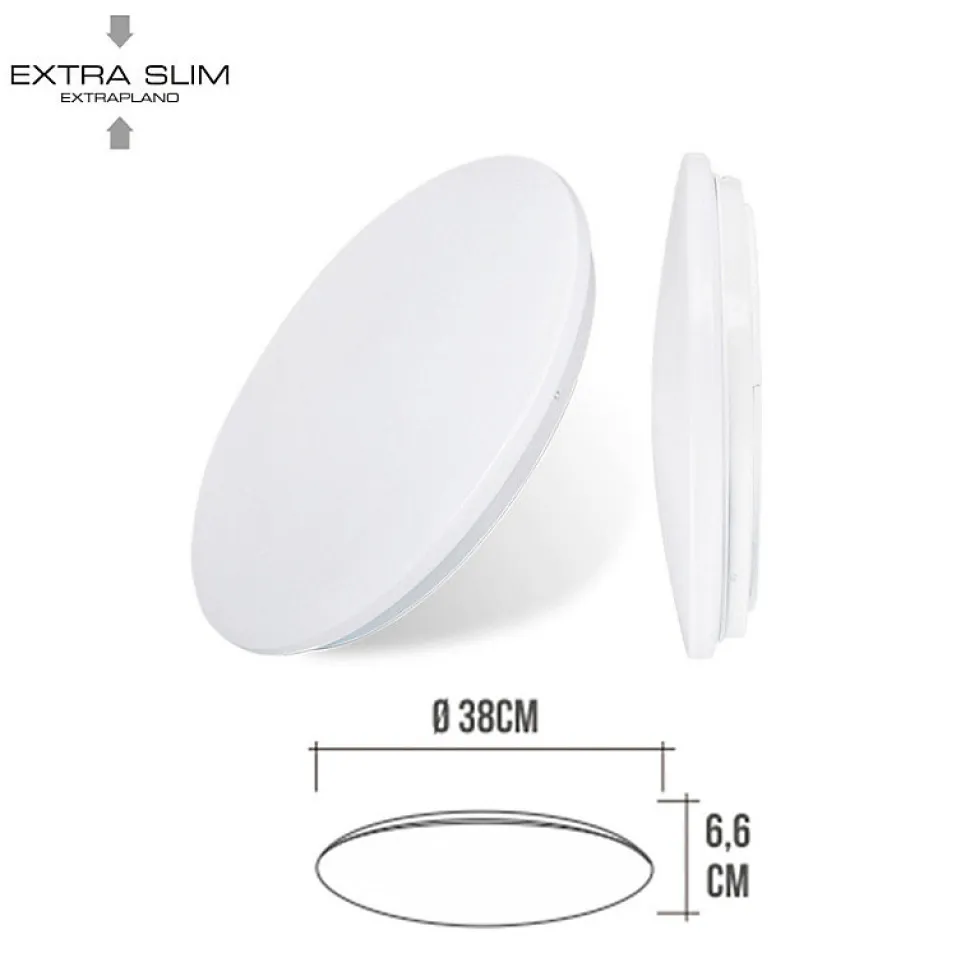 - Dimensions : diamètre : 38cm / hauteur : 6,6cm. Longue durée de vie : 25 000h. Garantie 3 ans. 4000K 24W 1680lm 100W 120° 25000h