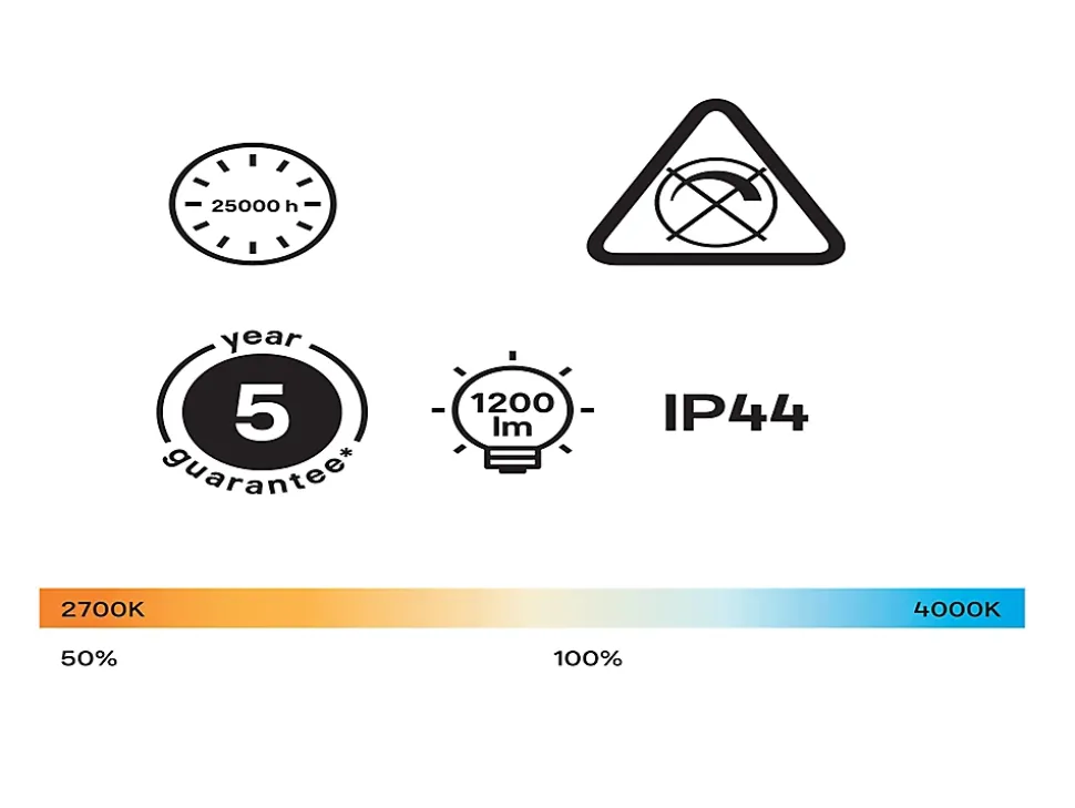 - Réglez la lumière à l’aide de votre interrupteur actuel. S’adapte à votre installation électrique actuelle. Aucun interrupteur spécifique n’est nécessaire. Appuyez une première fois sur l’interrupteur et l’ampoule s’allume dans une couleur neutre à une intensité de 100%, propice au travail. Appuyez une deuxième fois sur l’interrupteur et la lumière devient plus chaude à une intensité de 30%, propice à la détente. Appuyez une troisième fois sur l’interrupteur et la lumière s’éteint