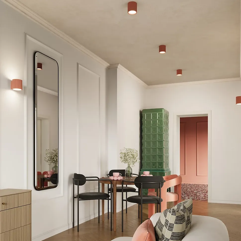 AURA est une série de lampes aux formes géométriques modernes et à la surface rainurée caractéristique. Leur design attire l’attention, mais ne domine pas – il complète parfaitement les intérieurs décorés dans un style moderne, scandinave ou minimaliste. Vous pouvez choisir parmi 10 couleurs soigneusement sélectionnées – des classiques blanc, noir et beige, en passant par les nuances à la mode de taupe, moka et vert olive, jusqu’aux accents expressifs : outremer, bordeaux, rouge ocre ou pêche. La série comprend des appliques murales avec un culot G9 et des plafonniers AURA 1 et AURA 2, disponibles dans les versions GU10 et GX53. Vous pouvez ainsi choisir librement votre source lumineuse en fonction de la pièce, de la fonction de la lampe ou de la couleur de lumière souhaitée. AURA est un éclairage qui attire l’attention, tout en offrant une grande flexibilité d’agencement. Il se distingue non seulement par son apparence, mais aussi par la qualité de sa fabrication – c’est un choix élégant et pratique pour votre intérieur.