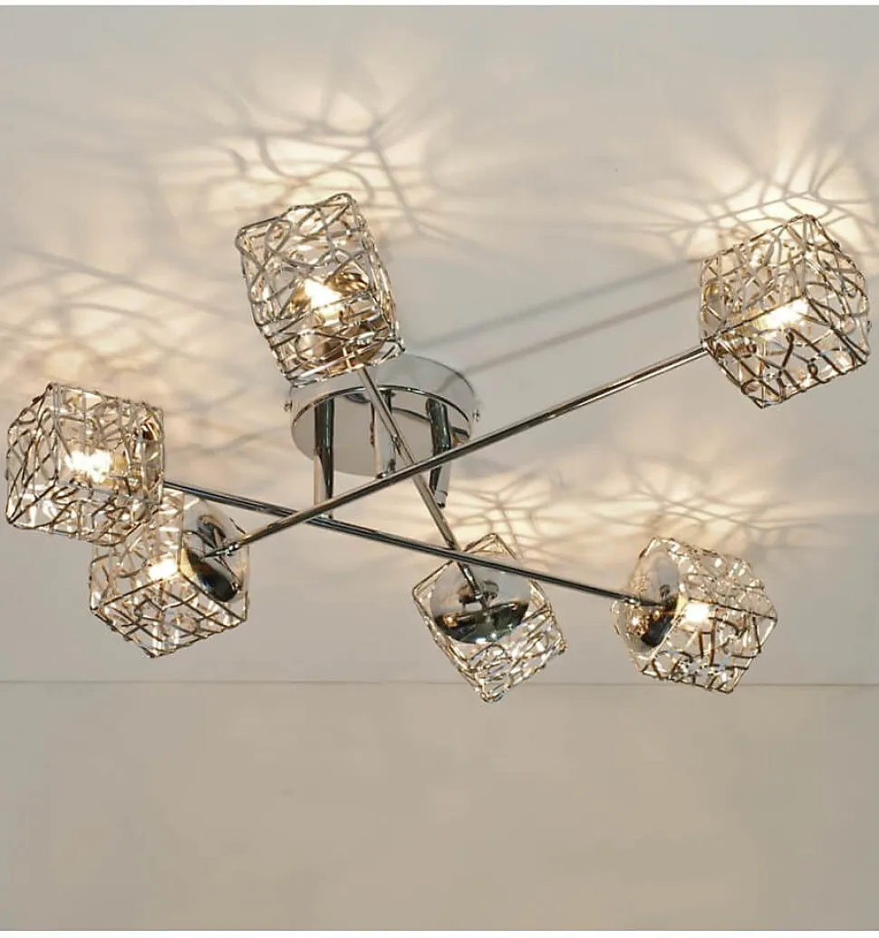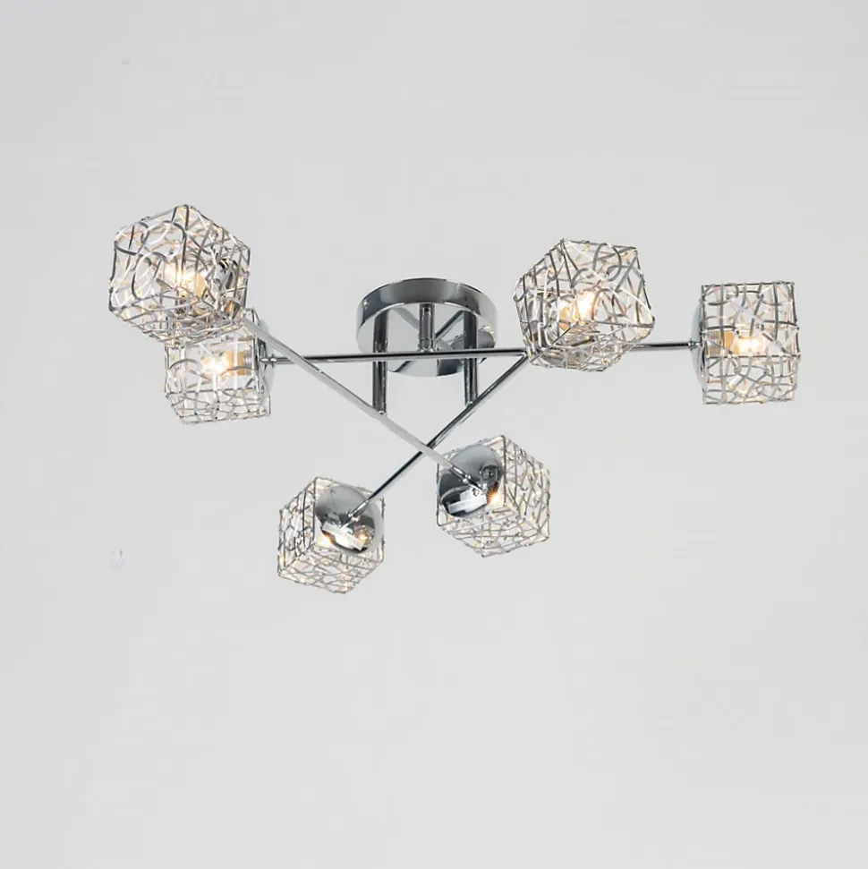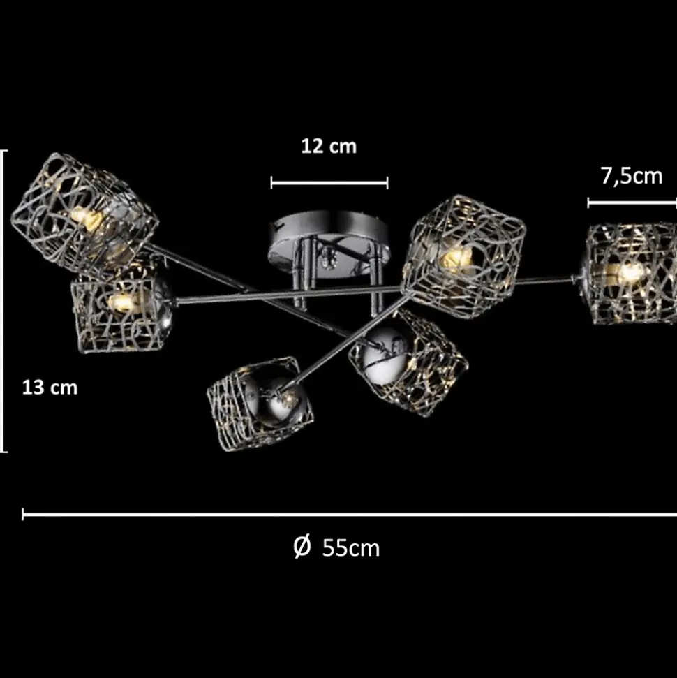 Plafonnier très design Aphyse fabriqué en métal chromé et en aluminium. Le luminaire est composé de 6 branches entremêlées au bout desquels se trouvent des cubes dessinés avec des motifs en aluminium. L’éclairage s’effectuera par 6 ampoules de culot G9 (non fournies) , qui permettront un rendu homogène sur tout l’espace.Existe aussi en 8 branches.) Assemblage simple requis (