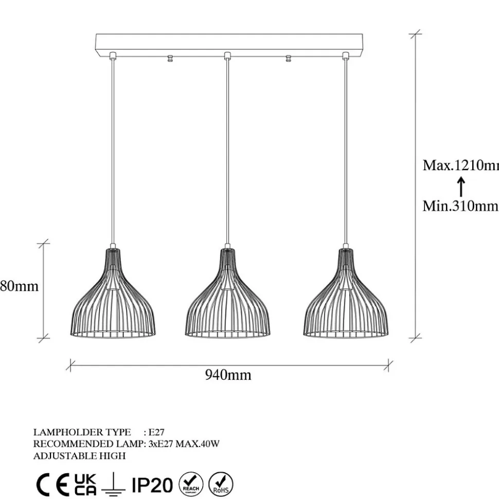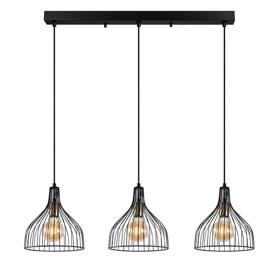 Le plafonnier en métal noir est une pièce élégante qui apporte une touche de caractère à votre intérieur. Avec ses 3 lampes, il diffuse un éclairage chaleureux, parfait pour créer une ambiance sophistiquée dans le salon ou la salle à manger. Son design moderne et minimaliste s’intègre harmonieusement dans tout type de décoration, ajoutant style et raffinement à votre espace.Caractéristiques techniques Couleur : Noir Matière : Métal Puissance : 40 W maximum Type d’usage : Intérieur Ampoule incluse : Non Nombre d’ampoules : 3 Type d’ampoule : E27 Réglage : Hauteur ajustableEntretienNettoyage facile à l’aide d’un chiffon humide.MontageMontage facile, une notice est fournie.Dimensions Diamètre du capuchon : 25 cm Hauteur du capuchon : 28 cm Taille : 94 x 25 x 121 cm Taille de la plaque de base : 78 x 6 cm Hauteur de la plaque de base : 4 cm Longueur du câble : 90 cm Poids total : 3,056 kgConditionnement Le produit est conditionné dans 1 colis de : 82 x 36 x 30 cm