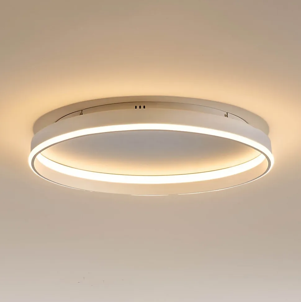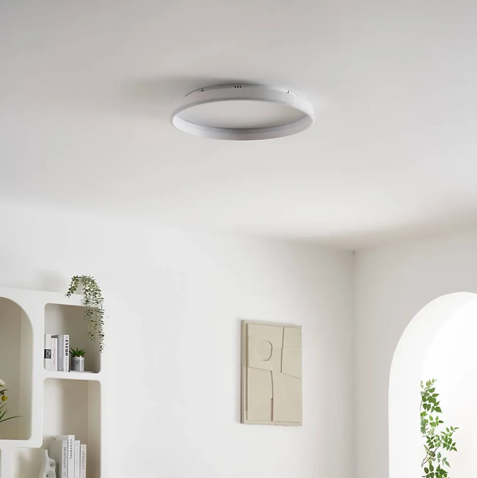 Soléane conjugue sobriété et technologie avec son grand disque blanc de 60 cm. Sa lumière LED dimmable s’ajuste facilement via la télécommande fournie. Idéal pour un salon ou une chambre contemporaine en quête d’un plafonnier à la fois puissant et raffiné.) Livré monté, prêt à installer (
