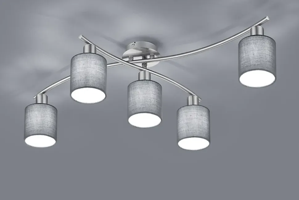 Plafonnier de la collection Garda de chez Trio.Quatre coloris: blanc, gris, or et argent.Dimension:75 x 44,2 cm (Lxl)22 cm de hautAbat jour en tissuAmpoule non incluse 5xE14, max. 40W