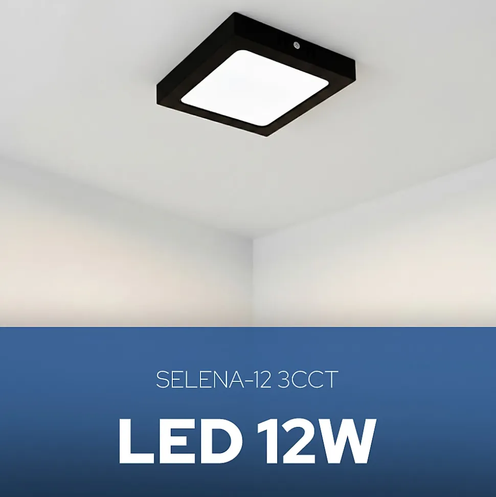 Plafonnier LED 12W 1050 lm 3CCT IP20 carré noir SELENA | HOROZLe plafonnier HOROZ SELENA 12W est un éclairage LED élégant, économe en énergie et pratique, conçu pour les intérieurs modernes ainsi que pour les espaces professionnels.Il convient parfaitement aux couloirs, halls d’entrée, chambres, cuisines, bureaux ou locaux commerciaux — partout où un éclairage fiable et esthétique est nécessaire.Son boîtier carré et minimaliste apporte une touche contemporaine à l’intérieur et s’intègre harmonieusement dans des aménagements clairs ou foncés. Sa conception fine en fait un élément discret qui met en valeur l’espace sans le surcharger.Paramètres techniques :✔️Type d’installation : En saillie✔️Application : Intérieur✔️Tension : 160–265V✔️Puissance : 12W✔️Flux lumineux : 1050 lm✔️Efficacité lumineuse : 87,5 lm/W✔️Température de couleur : 3CCT (3000K / 4000K / 6500K)✔️Indice de rendu des couleurs : >Ra70✔️Angle de diffusion : 120°✔️Matériau : Plastique (PC)✔️Classe de protection : II✔️Indice de protection : IP20✔️Dimmable : Non✔️Temps d’allumage : 15 000Dimensions :✔️Largeur : 140 mm✔️Hauteur : 32 mm