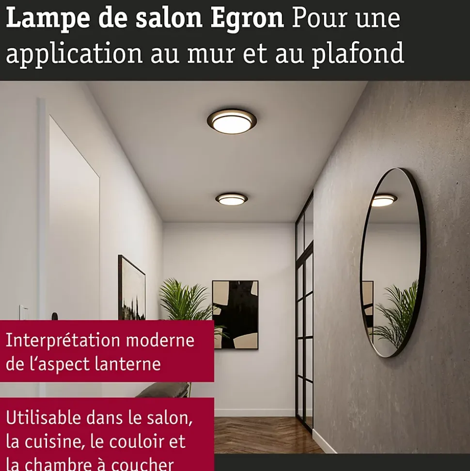 L’applique et plafonnier Egron est une interprétation moderne du style lanterne, qui séduit par sa conception de haute qualité et l’association de matières noble. Elle offre un éclairage d’ambiance uniforme basé sur la technologie LED ultramoderne et propose de plus une émission lumineuse latérale supplémentaire. Le plafonnier est facile à installer et dispose d’une fermeture à baïonnette. Le luminaire est gradable sur trois niveaux avec un interrupteur conventionnel. La fonction mémoire garantit l’enregistrement de la dernière luminosité choisie. Luminaire universel, Egron est utilisable aussi bien dans les espaces de vie, que dans la cuisine, le couloir ou la chambre à coucher. Il dispose d’un diffuseur satiné qui garantit une diffusion de la lumière uniforme. Sa température de couleur de 2700 K produit une lumière blanc chaud.