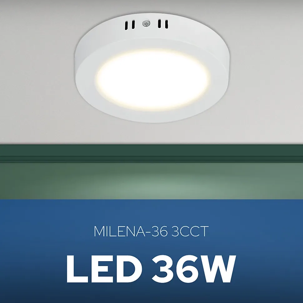 Plafonnier LED 36W 3600 lm 3CCT IP20 rond blanc MILENA | HOROZLe plafonnier HOROZ MILENA 36W est un éclairage LED élégant, économe en énergie et performant, conçu pour les intérieurs modernes ainsi que pour les espaces professionnels.Il est parfaitement adapté aux couloirs, halls d’entrée, chambres, cuisines, bureaux ou locaux commerciaux — partout où un éclairage puissant, fiable et esthétique est nécessaire.Son boîtier rond et minimaliste apporte une touche contemporaine à l’intérieur et s’intègre harmonieusement dans des aménagements clairs ou foncés. Sa conception fine en fait un élément discret qui souligne le style de la pièce sans dominer l’espace.Paramètres techniques :✔️Type d’installation : En saillie✔️Application : Intérieur✔️Tension : 160–265V✔️Puissance : 36W✔️Flux lumineux : 3600 lm✔️Efficacité lumineuse : 100 lm/W✔️Température de couleur : 3CCT (3000K / 4000K / 6500K)✔️Indice de rendu des couleurs : >Ra70✔️Angle de diffusion : 120°✔️Matériau : Plastique (PC)✔️Classe de protection : II✔️Indice de protection : IP20✔️Dimmable : Non✔️Temps d’allumage : 15 000Dimensions :✔️Diamètre : Ø290 mm✔️Hauteur : 32 mm