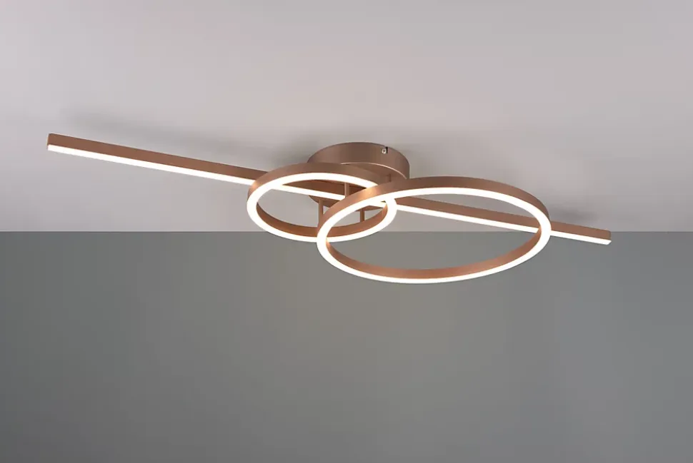 Les caractéristiques techniquesLe plafonnier Montilla de Trio combine technologie LED moderne et fonctionnalités avancées pour un confort d’éclairage optimal. Il dispose d’une source LED SMD intégrée de 54 watts délivrant une puissance lumineuse de 6300 lumens.Grâce à la télécommande fournie, vous pouvez régler facilement la température de couleur de 2700K à 6000K (du blanc chaud au blanc froid), ajuster l’intensité lumineuse, activer la fonction veilleuse ou mémoriser vos réglages favoris.Ce plafonnier est compatible avec une installation murale ou plafond, mais il ne convient pas à un variateur externe.Les avantages esthétiquesSon design graphique géométrique attire les regards, même lorsqu’il est éteint. L’association du métal couleur café et du diffuseur plastique blanc donne à ce luminaire une allure élégante et contemporaine.Il se marie parfaitement aux intérieurs modernes et apporte une touche décorative originale à tout salon, chambre ou bureau.Économie et durabilitéLa technologie LED permet une réduction de la consommation d’énergie jusqu’à 80 % par rapport aux ampoules halogènes classiques. Sa durée de vie estimée à 30 000 heures et ses 15 000 cycles d’allumage/extinction assurent un usage prolongé et fiable.