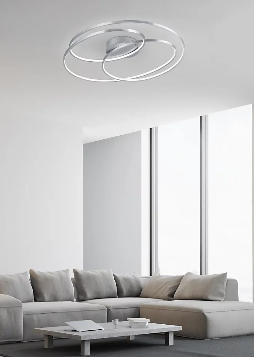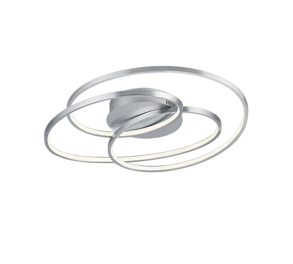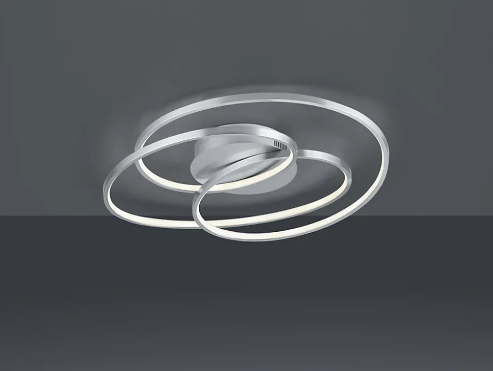 Les caractéristiques techniquesAvec son design dynamique et sculptural, le plafonnier GALE de Trio se distingue dans n’importe quelle pièce. Il est équipé d’une LED SMD intégrée de 38,5W délivrant un flux lumineux puissant de 5000 lumens en blanc chaud (3000K).Grâce à la fonction de variation à 3 niveaux via interrupteur mural (100% / 50% / 25%), vous adaptez la lumière à vos envies sans variateur externe. Il offre ainsi confort, économie et modernité dans un seul luminaire.Un style moderne et performantLa finition en nickel mat s’intègre parfaitement dans un intérieur contemporain. Compact (13,5 cm de hauteur), il convient aussi bien au salon, au couloir qu’au-dessus de la table à manger.Avec sa durée de vie de 30 000 heures et ses 15 000 cycles ON/OFF, le plafonnier GALE vous assure fiabilité et économies d’énergie jusqu’à 80 % comparé aux sources halogènes traditionnelles.