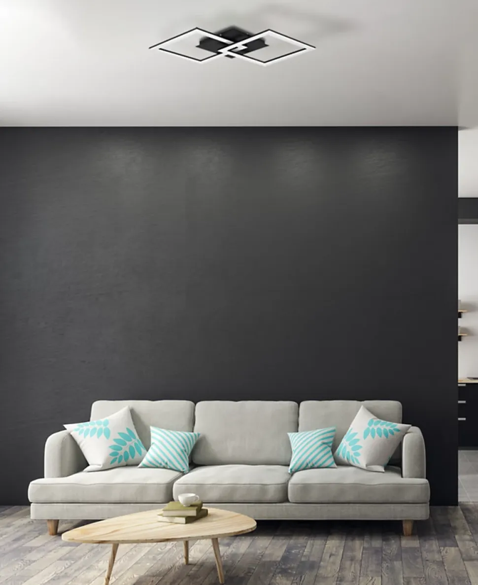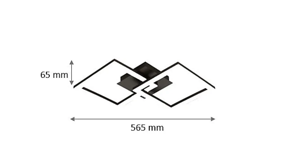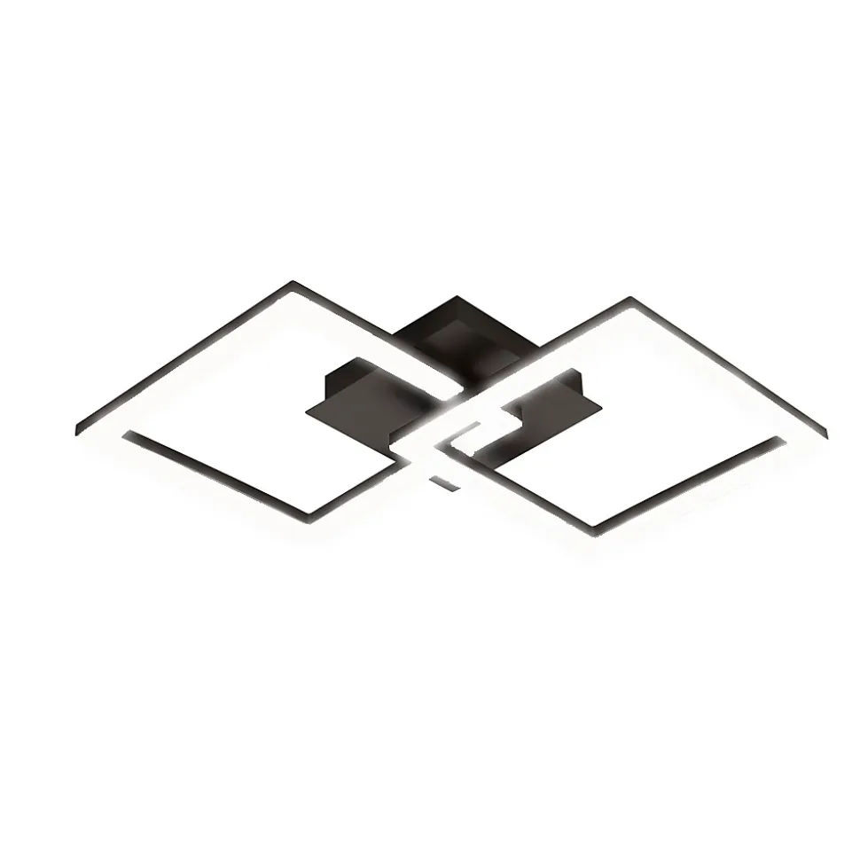 - Le plafonnier LED HUERTA est composé d’un socle en acier de couleur noir, et de deux carrés en acier avec un revêtement en plastique blanc pour laisser passer la lumière.