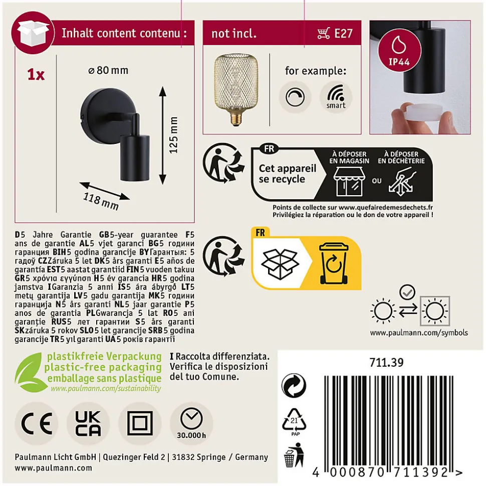 Protection contre les projections d’eau IP44, pour salle de bains|Ampoule E27 jusqu’à 60 watts max.|Ne pas oublier : Commandez l’ampoule adaptée en même temps !|Des effets lumineux décoratifs mettent le mur en scène