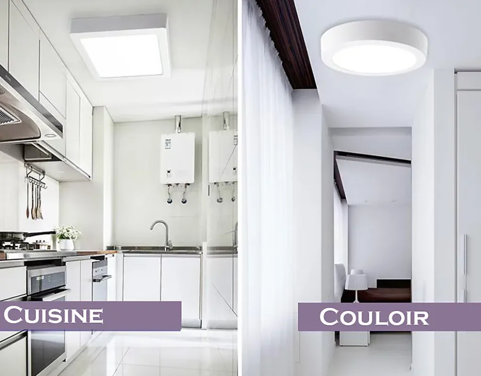 Température de couleur : Blanc Froid 6000KPuissance consommée : 18WFlux lumineux : 1600-1700 LumensDiamètre du spot : ø225xH40 mmCouleur du produit (y compris le cadre) : BlancIndice de protection : IP 20Garantie fabricant : 2 ans