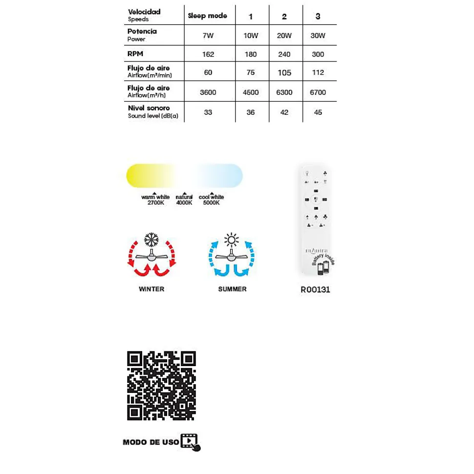 Plafonnier led Ventilateur Aloha 45WPlafonnier Ventilateur Aloha par Mantra4 vitesses ajustables pour un confort personnalisé avec télécommandeVariabilité de lumière de 2700K à 5000KPuissances de 7W à 30W adaptées aux pièces de 13 à 20m²Efficacité énergétique optimale avec moteur 30W et LED 45WGaranties étendues pour tranquillité d’esprit (2 ans pour le produit, 5 ans pour la led et 8 ans pour le moteur)Éclairage enveloppant sur 120 degrésQR codes pour accès pratique aux informations essentielles