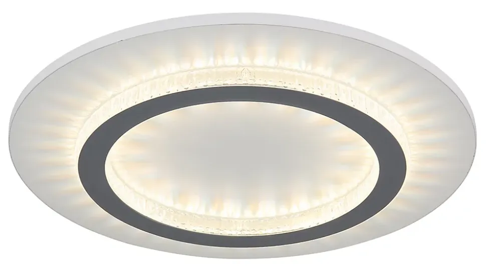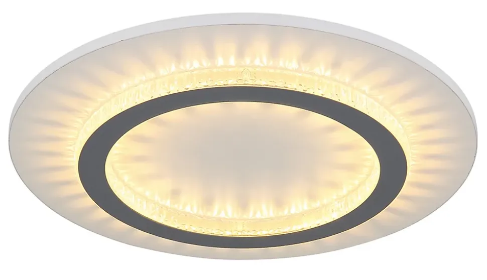 Plafonnier métal blanc mat, plastique blanc mat, cristaux en plastique translucide, plastique gris clair mat, Plusieurs intensités à gérer par un interrupteur mural, couleur fixe, Fonction de mémoire, ø: 350mm, H: 55mm, incl. LED 24W 230V, 3300lm Source, 920lm Output, CCT 3000/4000/6500K
