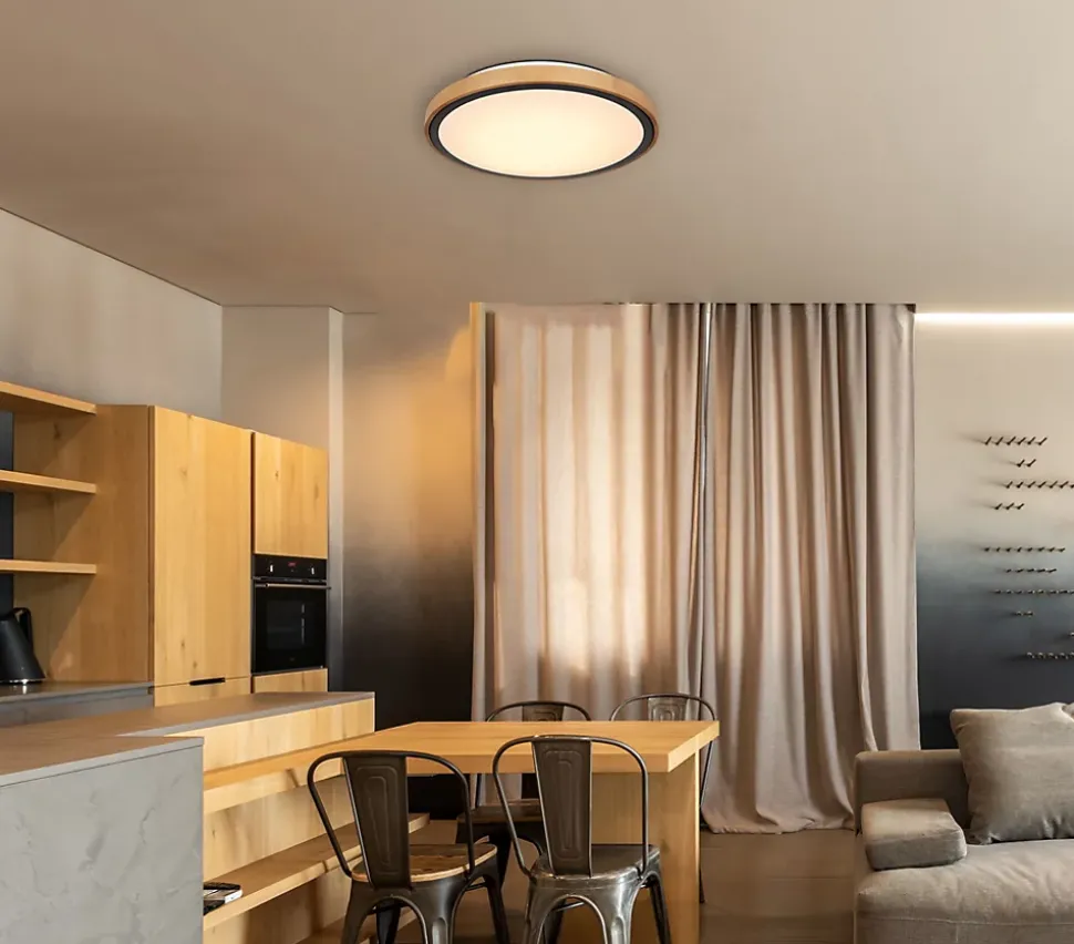 Ce plafonnier rond inspire par son superbe design. Dans un cadre en bois d’un diamètre de Ø44cm, il y a un panneau LED avec un cadre métallique supplémentaire. Cela peut être atténué et fixé dans les niveaux de lumière 3000 Kelvin blanc chaud, 4500 Kelvin neutre et 6000 Kelvin blanc froid.