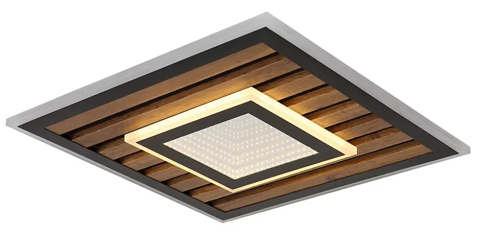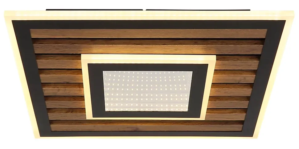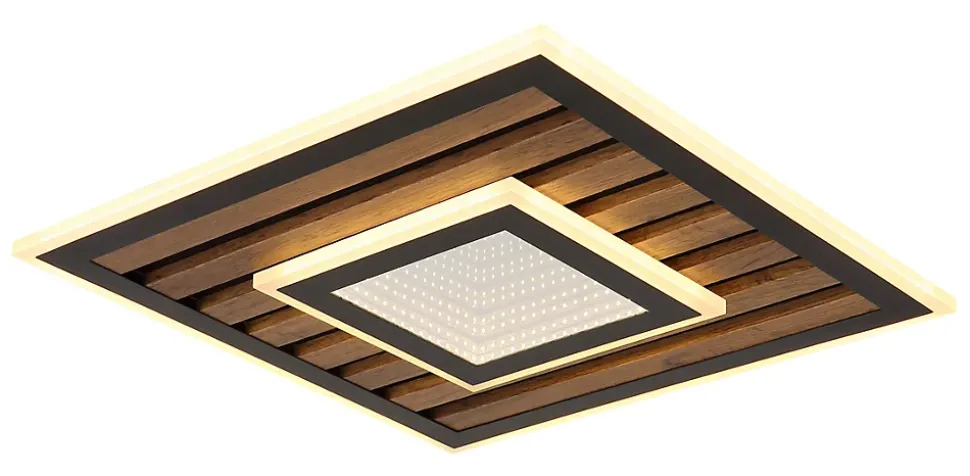 Plafonnier métal noir mat, MDF décor bois foncé, plastique opale, plastique réfléchissant Effet 3D, Plusieurs intensités à gérer par un interrupteur mural, Fonction de mémoire, LxPxH: 400x400x60mm, incl. LED 24W 230V, 2500lm Source, 1200lm Output, 3000K