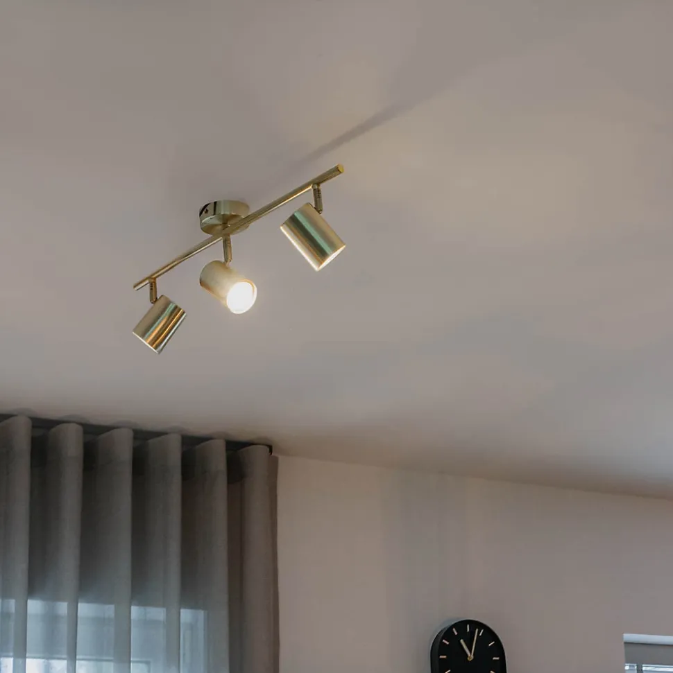 Ajoutez du style à votre intérieur avec le plafonnier moderne Jeana. Il est fait d’acier et fini en laiton. Jeana mesure 15,5 cm de haut, 50,5 cm de long et 8 cm de large. La plaque de montage a un diamètre de 8 cm et une hauteur de 2,5 cm. Vous pouvez compléter le plafonnier avec 3 ampoules, chacune avec un culot GU10 (35W maximum). Assurez-vous de les commander séparément. La lampe est dimmable avec un variateur externe (non inclus). Les spots sont orientables individuellement, vous pouvez donc toujours décider où la lumière brille. Jeana est le plafonnier idéal pour le salon, la chambre ou le bureau.