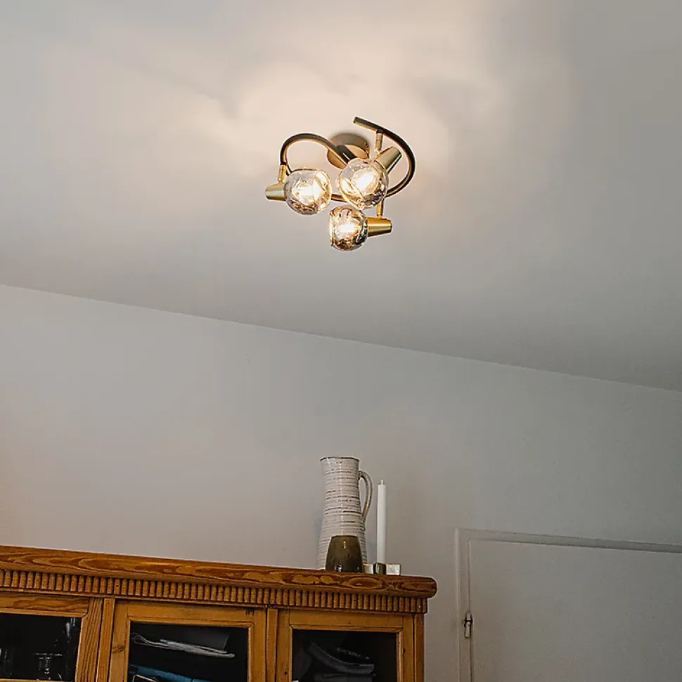 Adoptez le style Art déco avec notre luminaire Vidro. Fabriqué en acier et doté d’une finition dorée, il est agrémenté d’abat-jour en verre fumé qui créent un bel effet lumineux dans la pièce ! Le plafonnier a un diamètre de 44,5 cm et une hauteur de 19 cm. La plaque de montage a un diamètre de 8 cm. Le luminaire est livré sans ampoules. N’oubliez pas de commander trois ampoules E14 (25W maximum) avec celui-ci. L’effet verre fumé crée une ambiance particulière, mais si vous souhaitez la rendre encore plus intense, vous pouvez connecter le luminaire à un variateur d’intensité, qui n’est toutefois pas inclus. Le luminaire Vidro trouvera parfaitement sa place dans n’importe quelle pièce. Il est également un véritable atout de style dans un bureau !