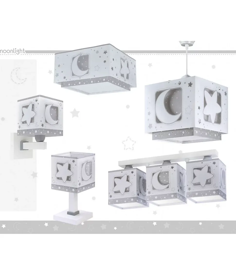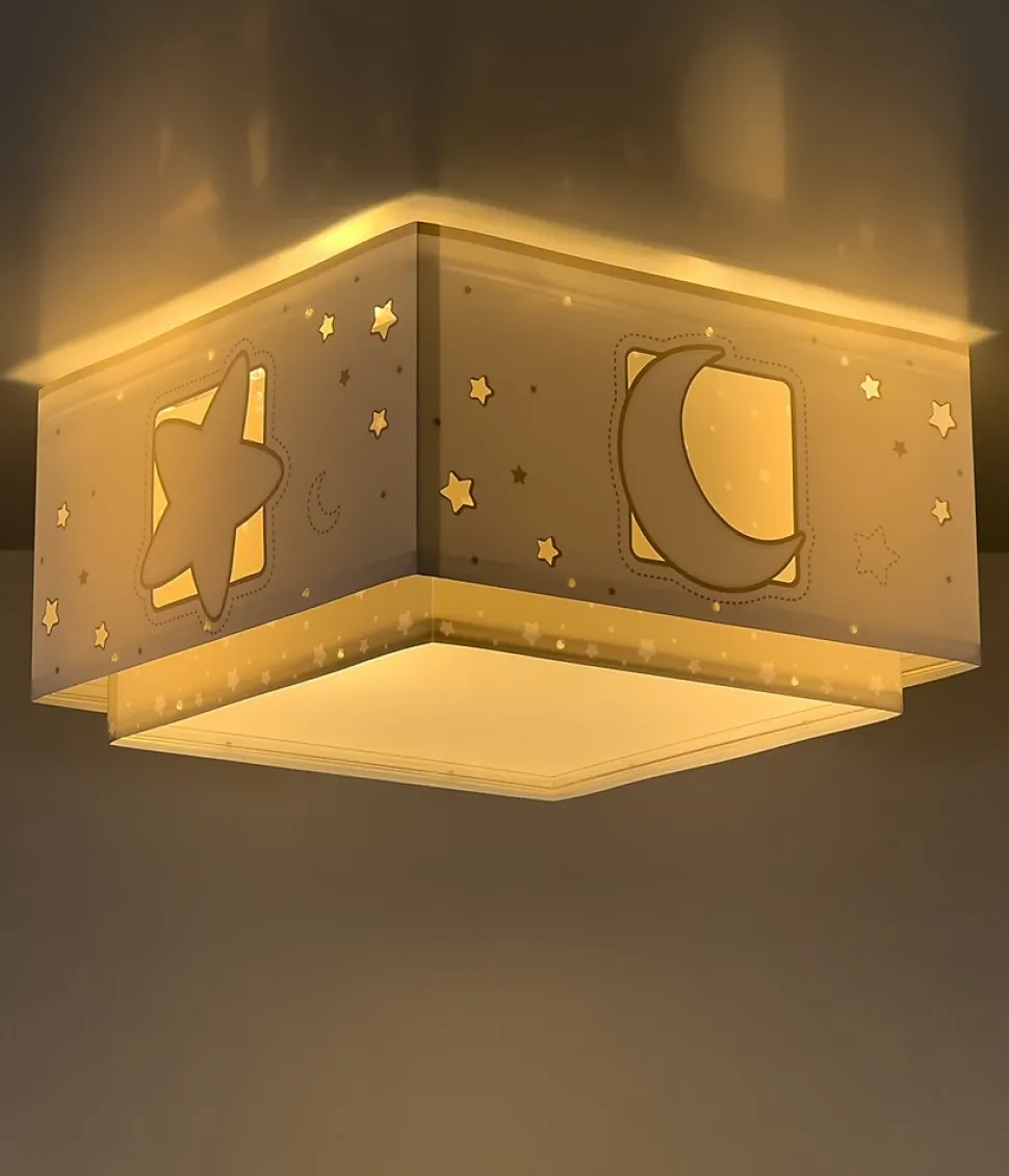 Plafonnier avec 2 lumières lune et étoile gris, composé d’un double abat-jour avec des motifs découpés et brille dans le noir.