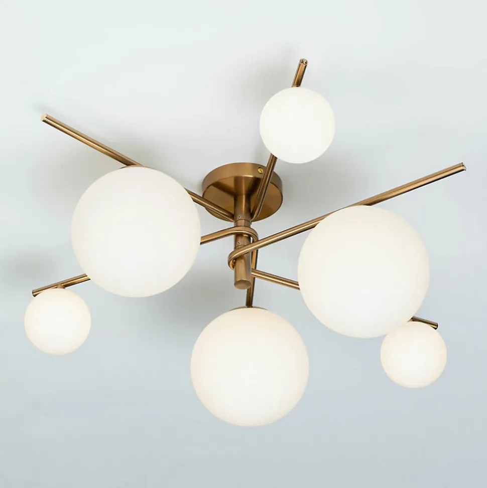 Découvrez Belisto, un plafonnier imposant de 70 cm de diamètre avec une structure en métal doré et des sphères en verre blanc laiteux. Son design mêlant formes rectilignes et arrondies offre une esthétique géométrique et moderne, illuminant vos pièces à vivre avec élégance et une atmosphère cocooning.) Assemblage simple requis (