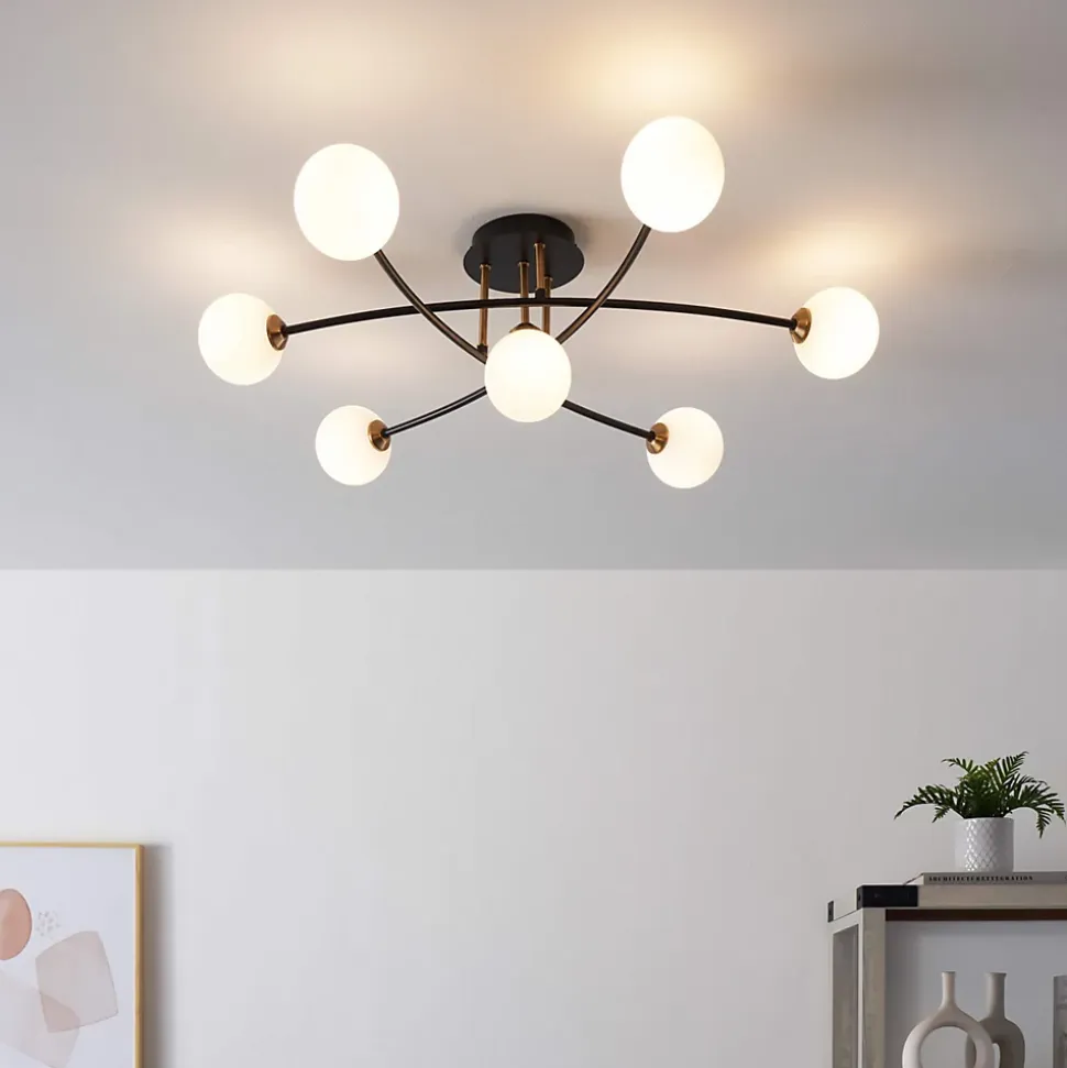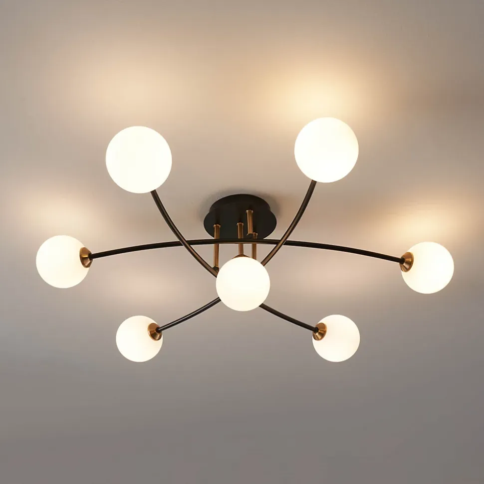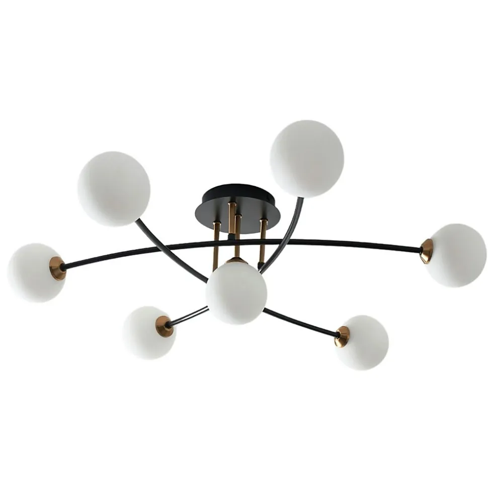Illuminateur votre espace avec élégance grâce au plafonnier Estrela, mêlant verre et métal noir et doré. Son design imposant de 85 cm de diamètre et ses bras étendus assurent une diffusion lumineuse homogène dans les grandes pièces. Estrela nécessite 7 ampoules G9 (max 5W), dissimulées à l’intérieur des sphères en verre vissées. Vous pouvez aussi choisir une version entièrement laiton pour un éclat supplémentaire.) Assemblage à faire par vos soins (