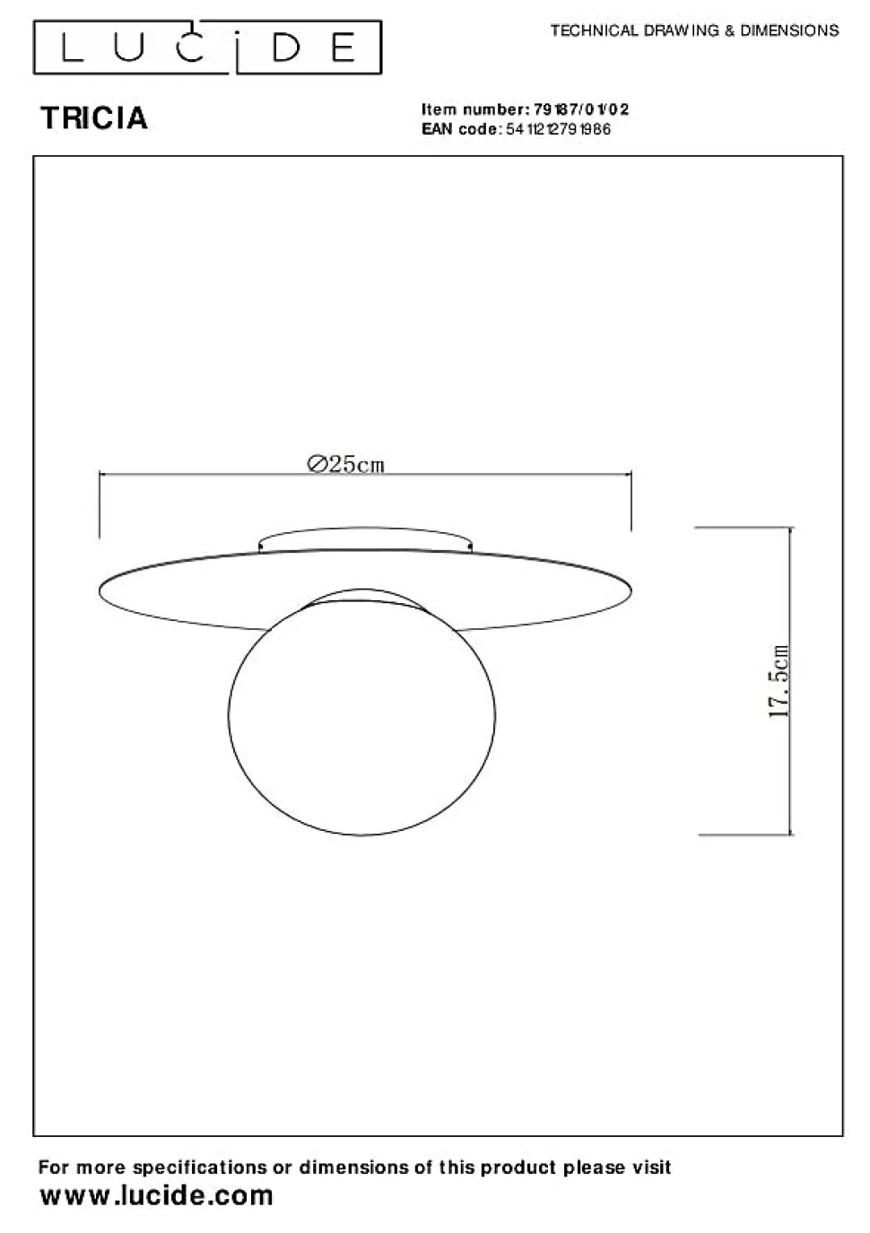 Une sphère illuminant le ciel – ou plutôt le plafond. Le plafonnier Tricia est une étoile brillante dans le firmament de l’éclairage. La sphère de verre renfermant la source lumineuse est fixée à un élégant disque métallique. Tels les anneaux de Saturne, ce disque reflète la lumière diffuse de Tricia. La combinaison d’un métal de haute qualité, d’un verre véritable et d’une finition mate confère à ce plafonnier un aspect moderne. De plus, vous pouvez facilement connecter la lampe à un variateur. Vous êtes ainsi maître de l’atmosphère à tout moment et dans n’importe quelle pièce.Caractéristiques uniques:• Utilisable avec une source lumineuse LED• Facile à connecter à un variateur (non fourni)• Fabriqué en métalPrincipales caractéristiques du produit:• Consommation énergétique: 1x15W / 230V / A intensité variable (Ampoule non incluse)• Dimensions: Ø25 cm Haut.17,5 cm• 2 Ans garantie sur le luminaire / source de lumière appropriée est EAN: 5411212491336Pourquoi choisir l’éclairage Lucide?Lucide incarne un design innovant, un savoir-faire artisanal et une fiabilité exemplaire. En tant qu’entreprise familiale belge avec plus de trois décennies d’expertise, nous concevons des éclairages de haute qualité qui enrichissent et transforment chaque espace, tant intérieur qu’extérieur. Notre collection polyvalente comprend des luminaires durables et des sources lumineuses économes en énergie, soigneusement conçus par nos propres experts et fabriqués selon les normes CE les plus strictes. Grâce à notre large gamme, nous vous proposons toujours une solution d’éclairage adaptée, quel que soit le style ou l’espace. Ainsi, nous illuminons non seulement votre espace de vie mais aussi votre processus de choix dans la recherche d’un éclairage de qualité et abordable. Chez Lucide, nous combinons innovation et savoir-faire pour un éclairage qui ajoute non seulement de l’ambiance, mais transforme chaque maison…