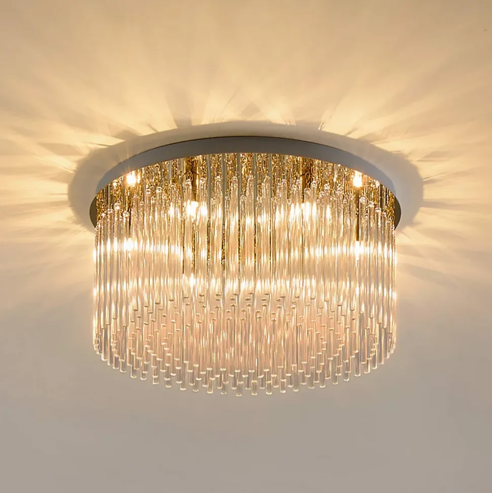 Le plafonnier Sandrilla est un modèle très chic qui fonctionne avec 6 ampoules G9 (non fournies). Mesurant 42 cm, il est compatible avec un variateur de luminosité. Son grand socle à la finition dorée brillante est orné de lames en verre transparent. Lorsqu’il est allumé, la lumière se réfléchit à travers les verres, produisant de superbes effets lumineux et un jeu de lumière captivant. Idéal pour votre salon ou votre salle à manger, ce luminaire apportera une touche d’élégance à votre espace. Retrouvez la collection Sandrilla ici.) Assemblage à faire par vos soins (