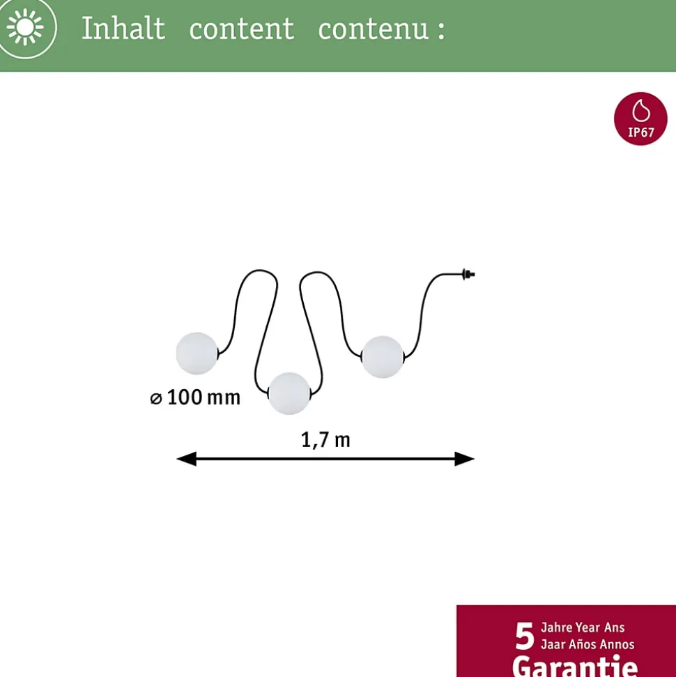 Guirlande décorative avec ampoules interchangeables|Kit d’extension comprenant 3 boules|Longueur totale de 1,7 m|Indice IP : IP 67 – Protection contre les immersions temporaires|À combiner avec tous les accessoires de la série Plug & Shine|Température de couleur : 3000K – blanc chaud|Ne pas oublier: commander simultanément le transformateur adapté!|Commutable et gradable par télécommande avec le régulateur Plug & Shine (voir accessoires)
