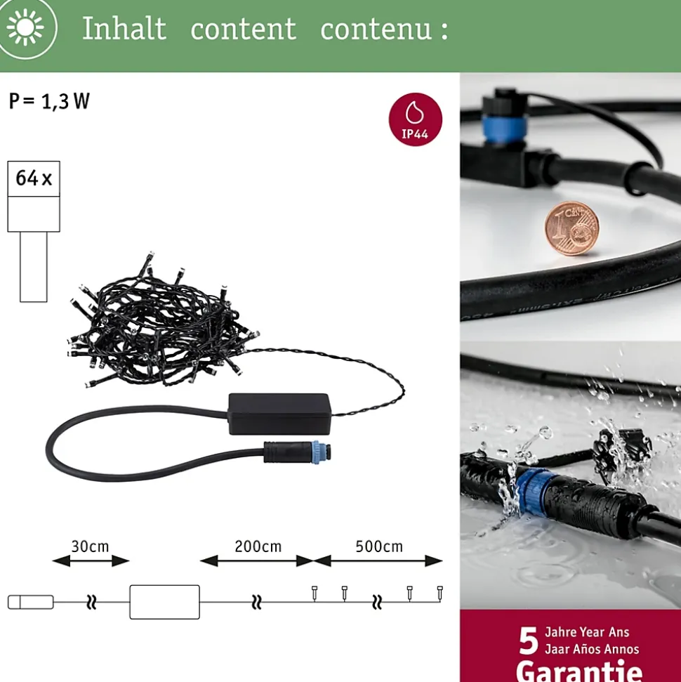 Longueur totale de 5 m|IP44 : Protection contre les projections d’eau en extérieur|Guirlandes lumineuses pour un éclairage ornemental additionnel dans le jardin, l’espace assis ou sur la terrasse|À combiner avec tous les accessoires de la série Plug & Shine|Température de couleur : 3000K – blanc chaud|Ne pas oublier: commander simultanément le transformateur adapté!|Commutable et gradable par télécommande avec le régulateur Plug & Shine (voir accessoires)