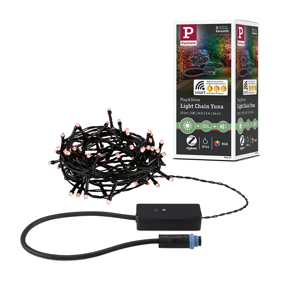 Longueur totale de 5 m|Commande confortable grâce à la technologie Zigbee|Large spectre de couleurs grâce au changement de couleur RGB-Multicolor|IP44 : Protection contre les projections d’eau en extérieur|Guirlandes lumineuses pour un éclairage ornemental additionnel dans le jardin, l’espace assis ou sur la terrasse|À combiner avec tous les accessoires de la série Plug & Shine|Ne pas oublier: commander simultanément le transformateur adapté!