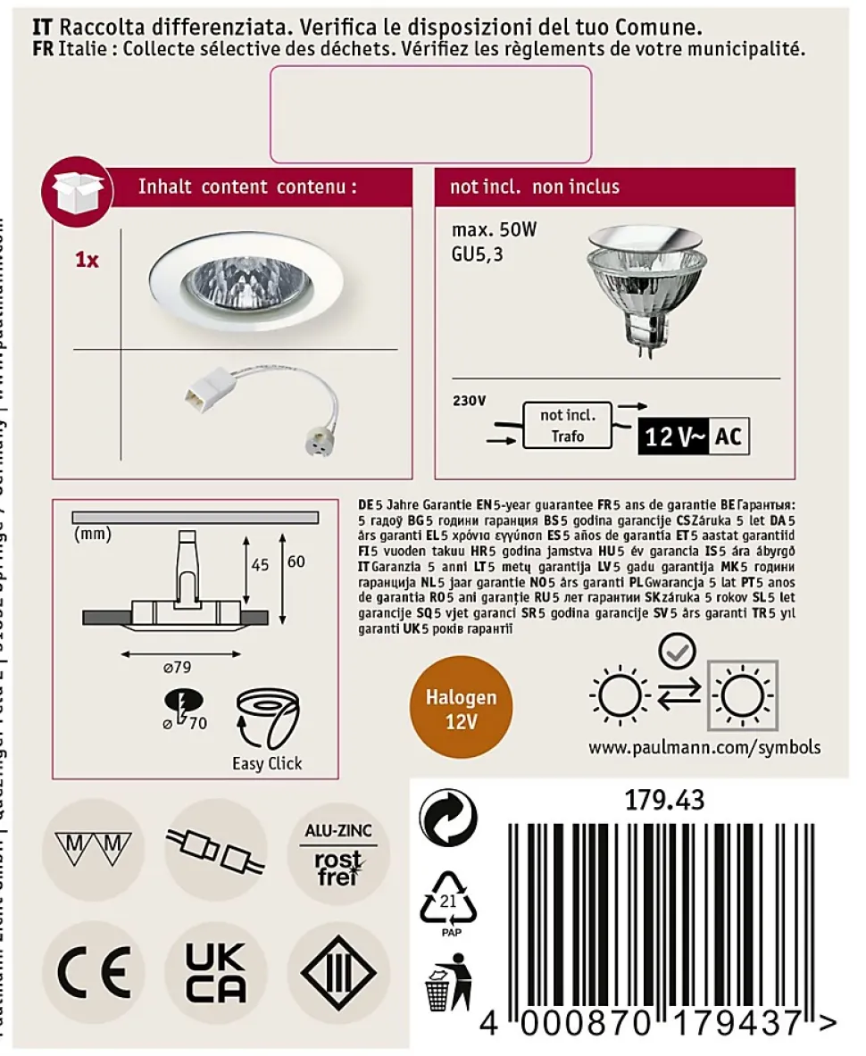 Encastré pour ampoule 12V GU5,3 LED ou halogène (voir ampoule adaptée)|Matériau: Alu zinc|Couleur: Blanc|des ampoules LED- ou en technologie halogène brillante sont conseillées pour ce luminaire|Protection IP44 (montage au plafond) – pour salles de bains et pièces humides.|La profondeur d’encastrement: 60mm|Diamètre: 79mm|Tension d’alimentation: 12 V|Fourni avec connecteur|Attention : commander la source adéquate et le transformateur|Changement d’ampoule particulièrement rapide et simple grâce à l’ingénieux système Easy-Click.