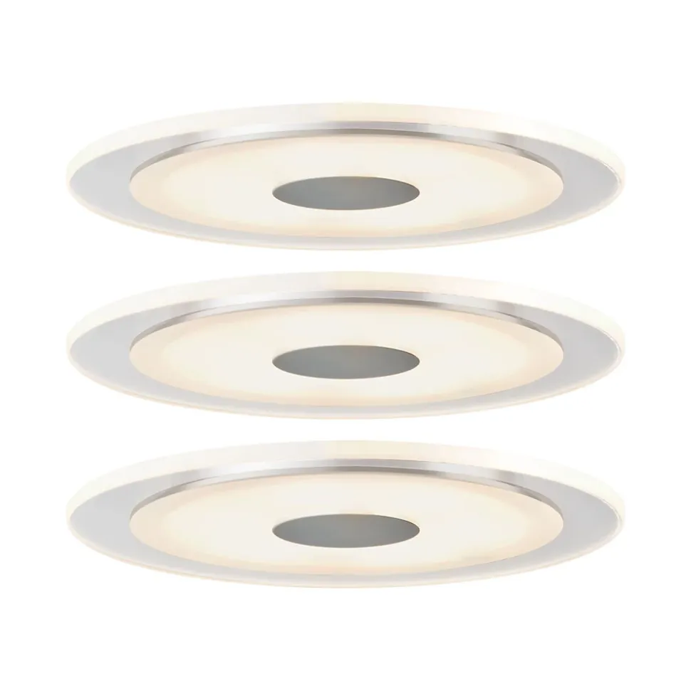 Kit composé de 3 luminaires fourni avec module LED|Matériau: Alu / Acryl|Couleur: Alu tourné / Satiné|Technologie LED basse consommation (fait économiser jusqu’à 80 % d’énergie par rapport aux ampoules à incandescence classiques)|Type de protection : IP23 (pour montage au plafond)|Diamètre: 150mm|Raccordement simple par connecteurs|Classe de protection II|Température de couleur: 3000K – Blanc chaud|Fourni avec transformateur