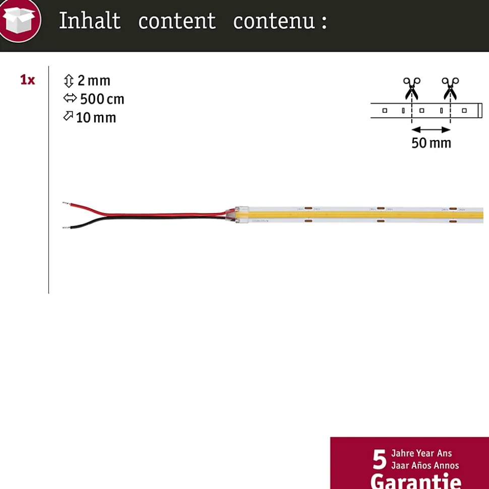 Le Pro Strip Gold P150 COB professionnel 24 V d’une longueur de 5 m et de température de couleur de 4000K, n’est pas pourvu de revêtement (IP20) et possède un câble de raccordement aux deux extrémités ouvertes. Avec 528 LED/m et 1400lm/m, le strip peut être utilisé comme éclairage de pièce sans source lumineuse supplémentaire. Les Pro Strips de qualité Silver conviennent parfaitement à une utilisation professionnelle dans des locaux commerciaux et privés et produisent une très bonne qualité de lumière avec un rendu des couleurs de CRI ≥ 80 et une consistance des couleurs de SDCM 5. Des composants de haute qualité garantissent une longue durée de vie d’au moins 30.000 heures. Commandez également le Controller et la télécommande, y compris la commande d’une ou de plusieurs zones, ainsi que les fonctions Quick Connect et réseau maillé. Vous avez également le choix entre les connecteurs Slim ou Quick, qui couvrent toutes les possibilités de raccordement et visent un encombrement minimal ou une installation efficace. De plus, une sélection d’alimentations à très longue durée de vie (50 000 heures) est disponible en cinq niveaux de puissance.