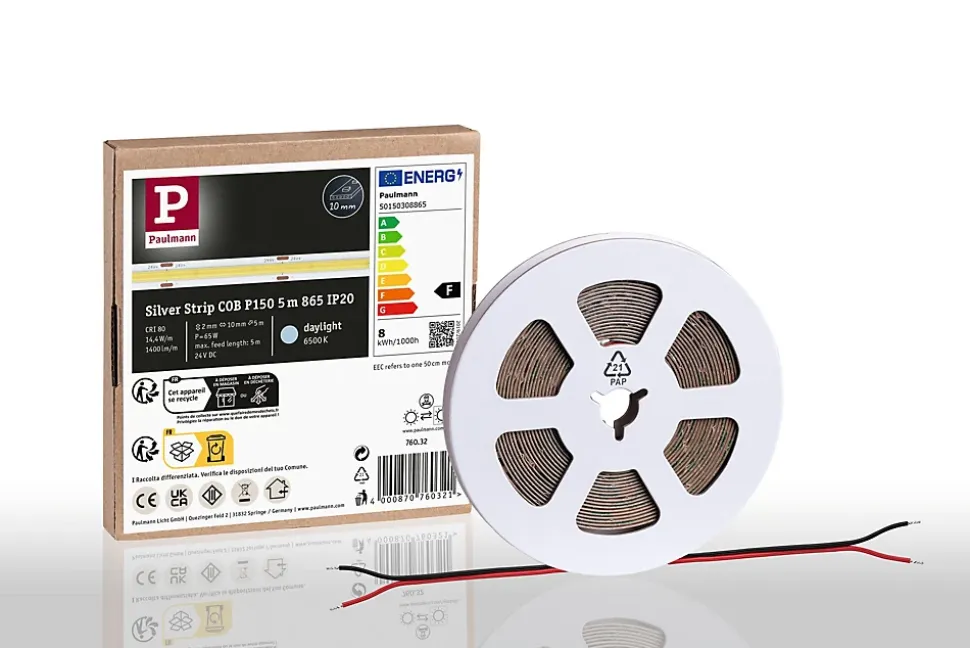 Le Pro Strip Gold P150 COB professionnel 24 V d’une longueur de 5 m et de température de couleur de 6500K, n’est pas pourvu de revêtement (IP20) et possède un câble de raccordement aux deux extrémités ouvertes. Avec 528 LED/m et 1400lm/m, le strip peut être utilisé comme éclairage de pièce sans source lumineuse supplémentaire. Les Pro Strips de qualité Silver conviennent parfaitement à une utilisation professionnelle dans des locaux commerciaux et privés et produisent une très bonne qualité de lumière avec un rendu des couleurs de CRI ≥ 80 et une consistance des couleurs de SDCM 5. Des composants de haute qualité garantissent une longue durée de vie d’au moins 30.000 heures. Commandez également le Controller et la télécommande, y compris la commande d’une ou de plusieurs zones, ainsi que les fonctions Quick Connect et réseau maillé. Vous avez également le choix entre les connecteurs Slim ou Quick, qui couvrent toutes les possibilités de raccordement et visent un encombrement minimal ou une installation efficace. De plus, une sélection d’alimentations à très longue durée de vie (50 000 heures) est disponible en cinq niveaux de puissance.