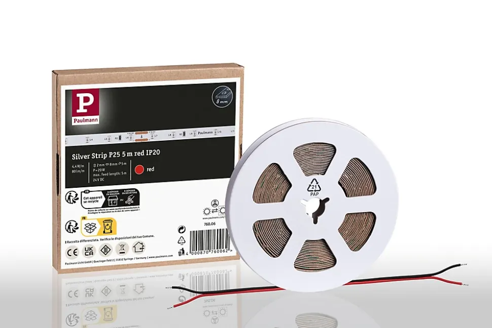Le Pro Strip Silver P25 professionnel 24 V d’une longueur de 5 m, de couleur rouge, n’est pas pourvu de revêtement (IP20) et possède un câble de raccordement aux deux extrémités ouvertes. Avec 60 LED/m et 80lm/m, il crée un éclairage d’appoint agréable. Les Pro Strips de qualité Silver conviennent parfaitement à une utilisation professionnelle dans des locaux commerciaux et privés et produisent une très bonne qualité de lumière avec un rendu des couleurs de CRI ≥ 80 et une consistance des couleurs de SDCM 5. Des composants de haute qualité garantissent une longue durée de vie d’au moins 30.000 heures. Commandez également le Controller et la télécommande, y compris la commande d’une ou de plusieurs zones, ainsi que les fonctions Quick Connect et réseau maillé. Vous avez également le choix entre les connecteurs Slim ou Quick, qui couvrent toutes les possibilités de raccordement et visent un encombrement minimal ou une installation efficace. De plus, une sélection d’alimentations à très longue durée de vie (50 000 heures) est disponible en cinq niveaux de puissance.