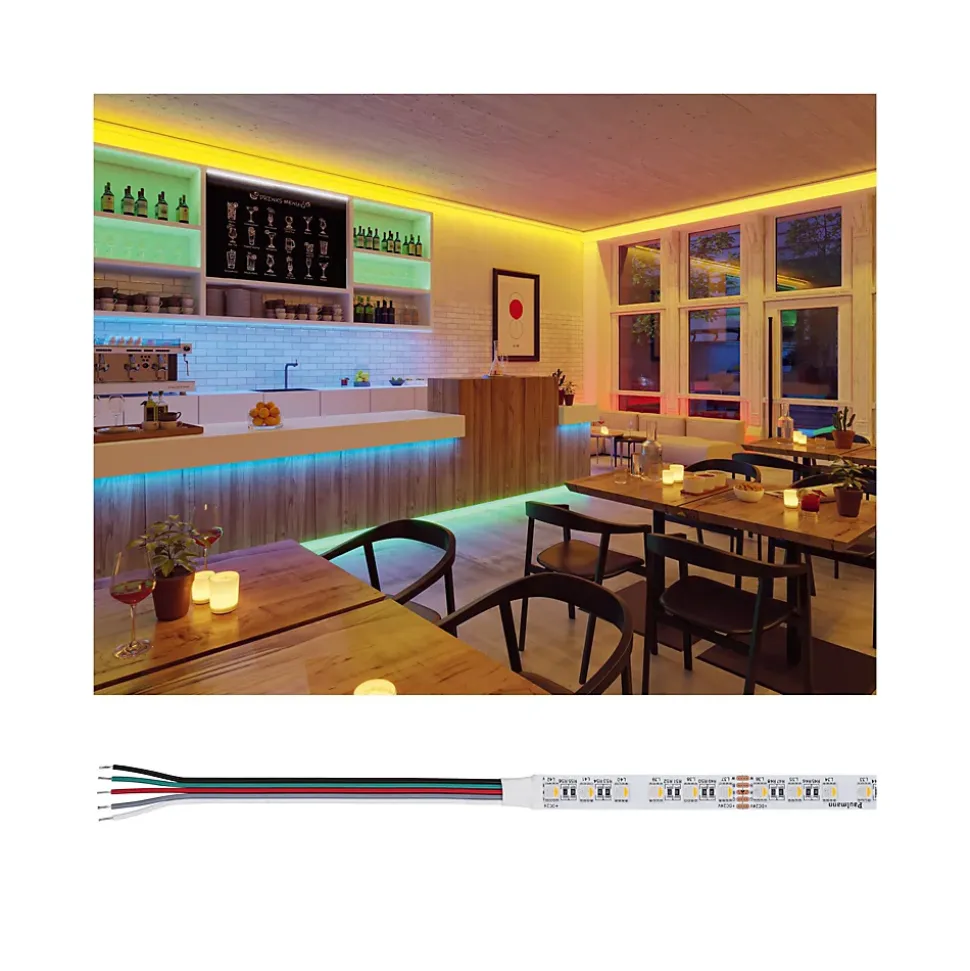 Le Pro Strip Silver P75 RGBW professionnel 24 V d’une longueur de 5 m n’est pas pourvu de revêtement (IP20) et possède un câble de raccordement aux deux extrémités ouvertes. La fonction de changement de couleur RGBW permet de définir différentes couleurs. Avec 84 LED/m et 700lm/m, il crée un éclairage d’appoint puissant. Les Pro Strips de qualité Silver conviennent parfaitement à une utilisation professionnelle dans des locaux commerciaux et privés et produisent une très bonne qualité de lumière avec un rendu des couleurs de CRI ≥ 80 et une consistance des couleurs de SDCM 5. Des composants de haute qualité garantissent une longue durée de vie d’au moins 30.000 heures. L’utilisation de LED haute puissance permet d’atteindre un rendement exceptionnellement élevé de 43, ce qui représente une économie d’énergie et des frais courants considérables. Commandez également le Controller et la télécommande, y compris la commande d’une ou de plusieurs zones, ainsi que les fonctions Quick Connect et réseau maillé. Vous avez également le choix entre les connecteurs Slim ou Quick, qui couvrent toutes les possibilités de raccordement et visent un encombrement minimal ou une installation efficace. De plus, une sélection d’alimentations à très longue durée de vie (50 000 heures) est disponible en cinq niveaux de puissance.