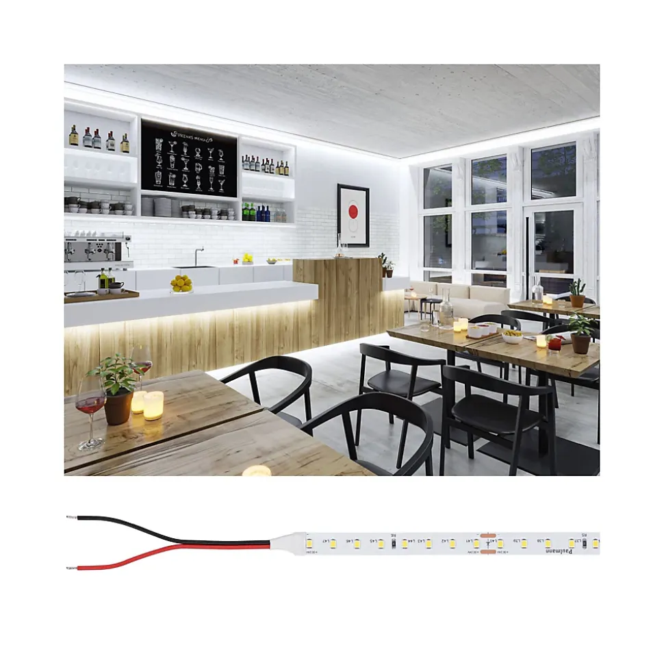 Des Strips LED de haute qualité pour des projets d’éclairage intérieur professionnels|Longue durée de vie de 30 000 h|Rendu des couleurs CRI ≥ 80 et consistance des couleurs SDCM 5|Câble d’alimentation bilatéral (200 mm)|Une logistique optimisée et durable : Emballage petit, compact et sans plastique|Ensemble d’accessoires complet : Connecteurs, commandes et accessoires d’alimentation correspondants disponibles|Sécurité de planification grâce aux données DIALux disponibles