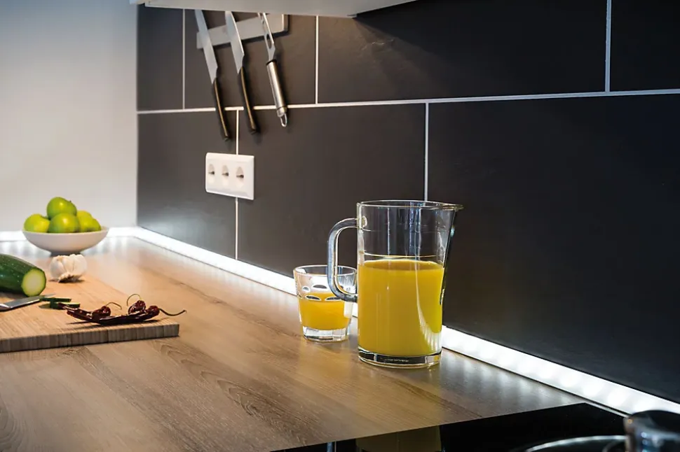 Delta Profil peut être équipé de rubans YourLED dans la température de couleur de votre choix et permet de mettre en valeur plinthes et cornières. Également utilisable comme éclairage supplémentaire de surfaces utiles ou d’éléments bas ou, pour les zones à l’ombre ou dangereuses, comme éclairage d’orientation et de guidage. Éclairage permanent par les composants LED.