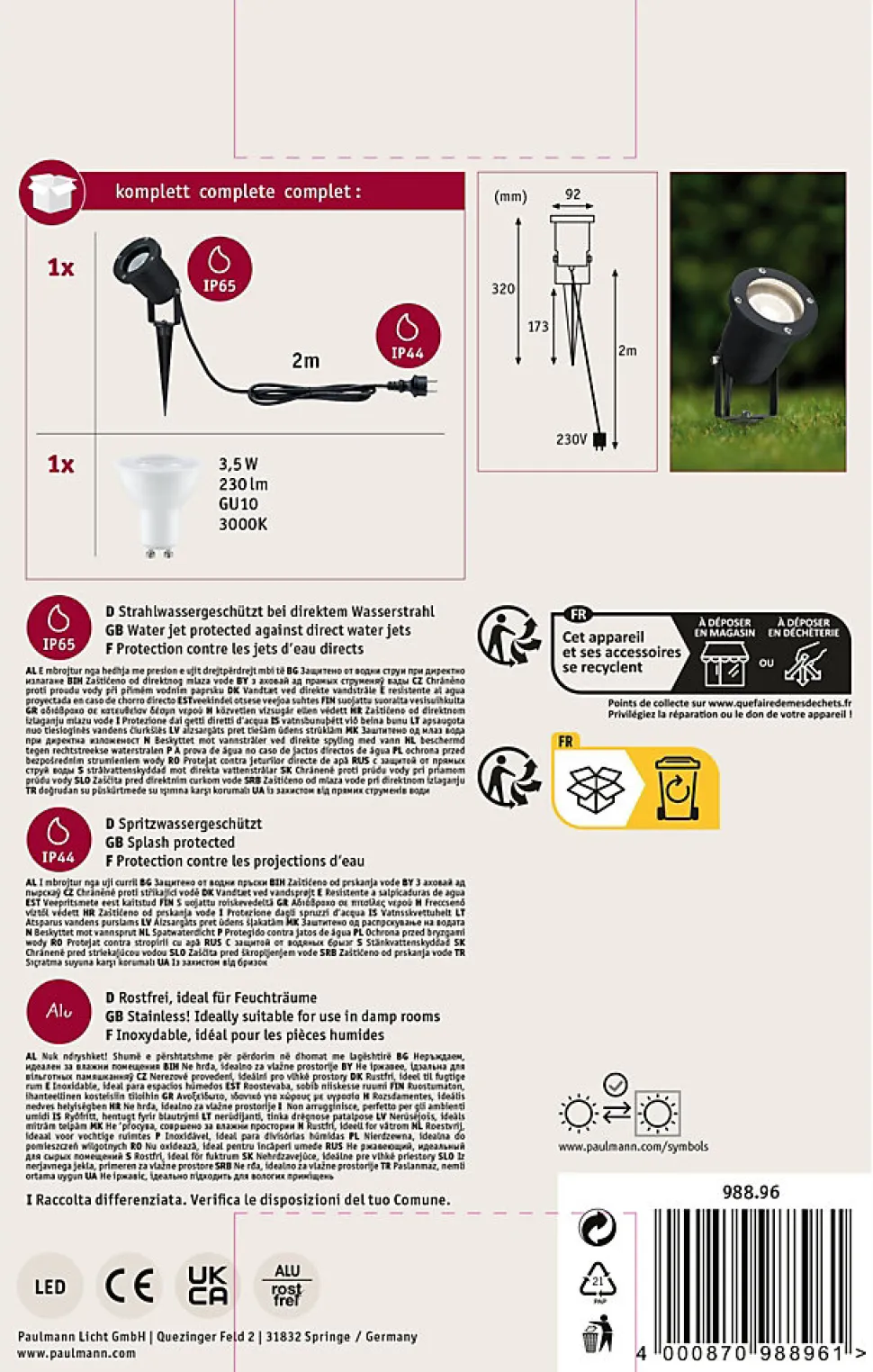 Le spot de jardin réglable éclaire vos fleurs, arbustes et arbres dans une lumière blanc chaud. L’ampoule adaptée est fournie. Si vous le souhaitez, vous pouvez aussi utiliser le luminaire sans piquet en tant que spot en saillie pour l’éclairage des façades, des abris de jardin et des terrasses.