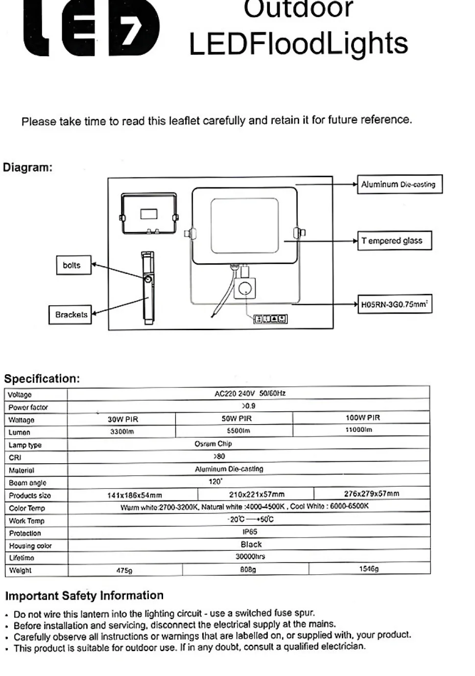 Température de lumière : 3000KDimension : 141*111*54mmPuissance nominale : 30WTension nominale : AC 220-240V 50HzPuce LED : OSRAMAngle de diffusion : 120°Flux lumineux : 3300LmIndice d’étanche : IP65IRC : >80RaGarantie : 3 ans