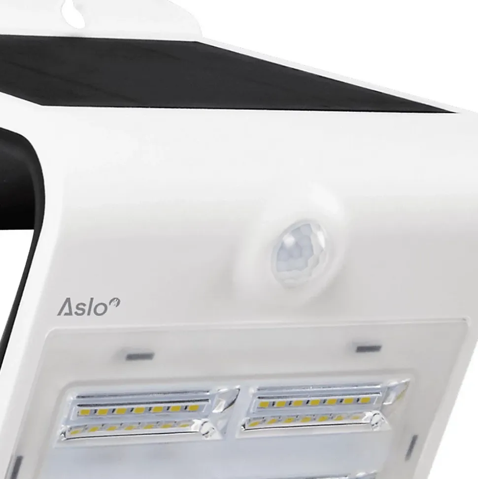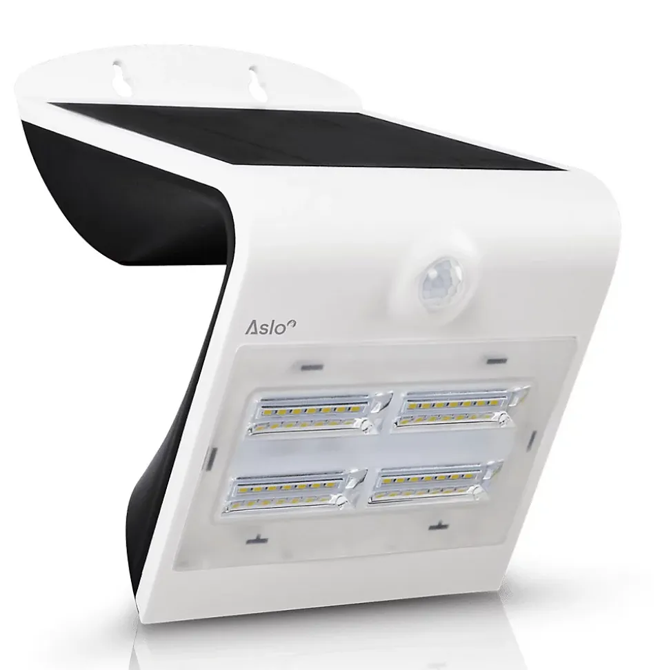 Le projecteur solaire à détecteur de mouvement ASLO offre un éclairage extérieur économique, et intelligent. Il est conçu pour s’adapter à toutes les conditions météorologiques.Avec des modes d’éclairage intelligents et une batterie remplaçable, ce lampadaire solaire répond aux différents besoins d’éclairage extérieur : sécurité / décoratif. Choisissez l’efficacité énergétique et l’éclairage automatisé avec ce projecteur à panneau solaire polyvalent.Le spot solaire ASLO vous offre trois modes d’éclairage pour répondre à divers besoins :- Mode A (1 clic) : L’éclairage s’active automatiquement à la tombée de la nuit à 20 % d’intensité et s’éteint après 5 heures.- Mode B (2 clics) : L’éclairage s’active automatiquement à 100 % d’intensité (400 lm) lors de la détection d’un mouvement dans un rayon de – Mode C (3 clics) : L’éclairage s’active automatiquement à 100 % (400 lm) lors de la détection d’un mouvement dans un rayon de – 4 clics pour éteindreCaractéristiques : – Nombre de LED : Avant 28 / Arrière 2. – Puissance lampe : 3.2W. – Puissance panneau solaire : 2.3W.- Température de couleur : Avant : 6000K (blanc froid) / arrière : 3000K (blanc chaud).- Flux lumineux : 400 Lm. – Matière : Corps : ABS / Diffuseur : polycarbonate / Panneau solaire : Silicium monocristallin. – Batterie lithium 2 Ah – 3.7 V. – Détecteur de mouvements. – Angle de détection : 120°.- Distance de détection : 2-6m. – Hauteur détection : 4m.- Utilisation : extérieur. – Fixation saillie, sur mur. – Anti-UV. – Résistant au feu. – Indice de protection : IP65. – Classe d’isolation : III. – Normes CE/RoHS.- Dimensions : 14 x 10.9 x 21.2 cm. – Poids : 0.69 kg.