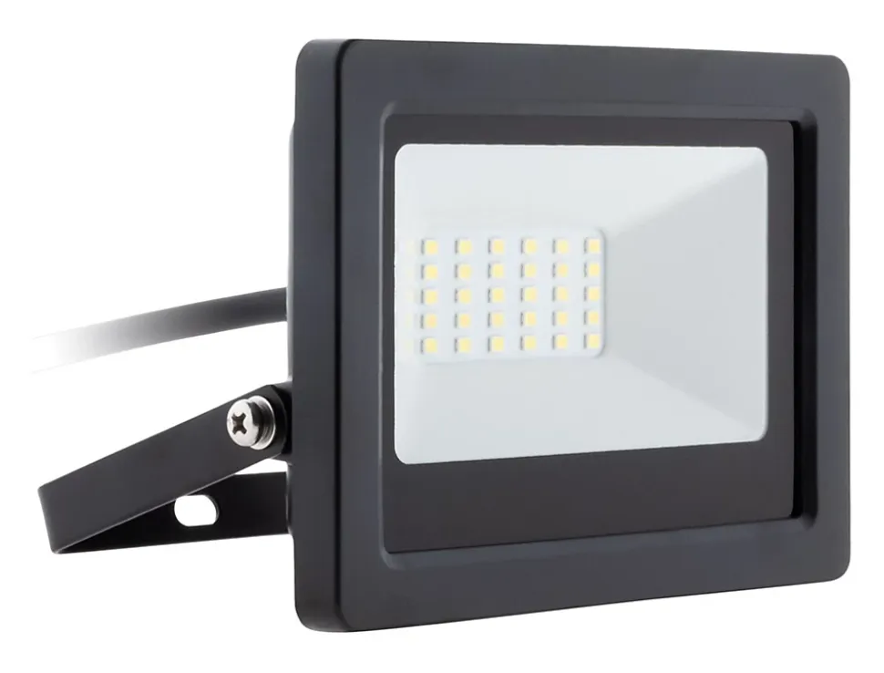Projecteur étanche (IP65), LED SMD 2835, Portée d’éclairage : 5 mètres, Design compact, Puissance : 20 Watts, Flux lumineux : 1600 lumens, Kelvins : 6000K (blanc froid), Câble : 35cm H05RN-F 3G*1.00mm, Matériaux : corps en aluminium, Angle de diffusion : 120°