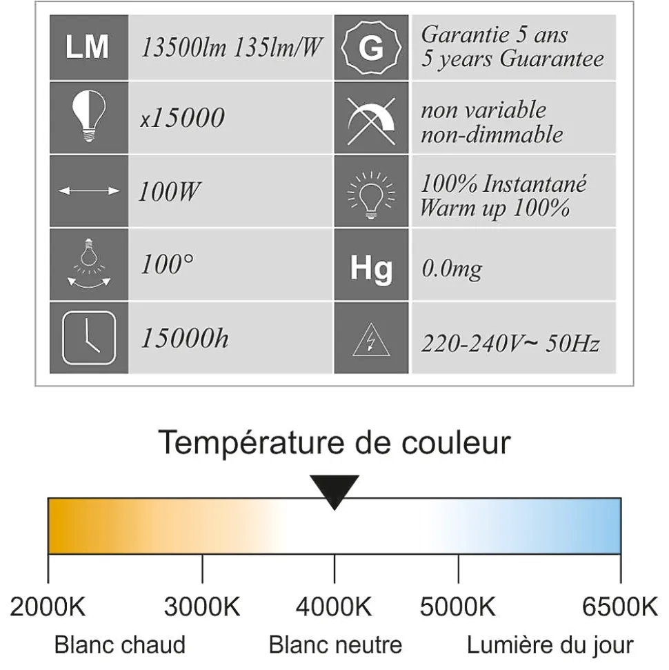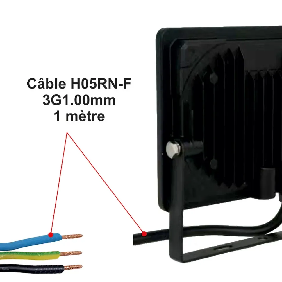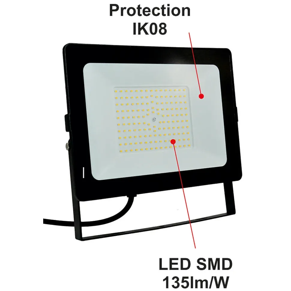 Ce projecteur LED professionnel de 100W offre une puissance lumineuse exceptionnelle de 13500 lumens avec un rendement élevé de 135 lm/W, garantissant un éclairage intense et homogène.Grâce à son indice de protection IP65, il est parfaitement adapté à une utilisation en extérieur, que ce soit pour éclairer façades, jardins, parkings, zones de stockage ou entrepôts. Son indice de résistance aux chocs IK08 assure une grande robustesse, idéale pour des installations sur des terrains sportifs (tennis, football, course à pied).Avec une épaisseur de seulement 41 mm, ce projecteur est fin mais ultra-résistant, conçu en aluminium pour une dissipation thermique optimale et une longévité accrue. Son angle de diffusion de 100° couvre une large surface tout en assurant un éclairage puissant et uniforme.Livré avec un câble de 1 mètre (H05RN-F 3G1.00mm² avec protection terre), ce projecteur est facile à installer et garantit une utilisation sécurisée.