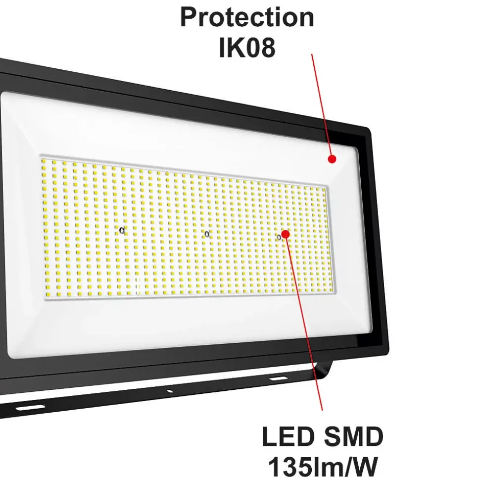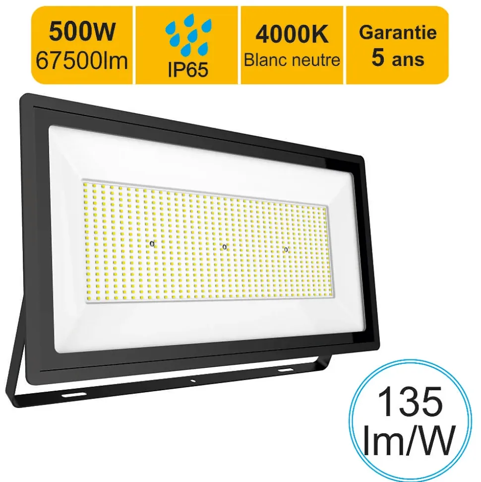 Ce projecteur LED professionnel de 500W offre une puissance lumineuse exceptionnelle de 67500 lumens avec un rendement élevé de 135 lm/W, garantissant un éclairage intense et homogène.Grâce à son indice de protection IP65, il est parfaitement adapté à une utilisation en extérieur, que ce soit pour éclairer façades, jardins, parkings, zones de stockage ou entrepôts. Son indice de résistance aux chocs IK08 assure une grande robustesse, idéale pour des installations sur des terrains sportifs (tennis, football, course à pied).Avec une épaisseur de seulement 34 mm, ce projecteur est fin mais ultra-résistant, conçu en aluminium pour une dissipation thermique optimale et une longévité accrue. Son angle de diffusion de 100° couvre une large surface tout en assurant un éclairage puissant et uniforme.Livré avec un câble de 1 mètre (H05RN-F 3G1.00mm² avec protection terre), ce projecteur est facile à installer et garantit une utilisation sécurisée.