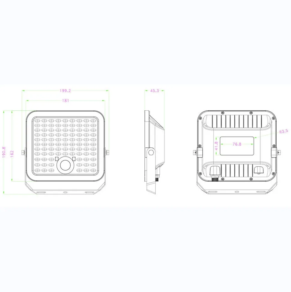 Projecteur LED à énergie solaire avec détecteur de présence et panneau déportéMatière : ABS renforcé – résistant aux chocs et aux intempériesFlux lumineux : 2000 lumens – éclairage puissant et homogènePanneau solaire : Monocristallin – 6V / 10W, rendement énergétique optimiséPuissance d’éclairage : 100W – efficacité énergétique élevéeAngle de diffusion : 90° – large couverture lumineuseDurée d’illumination : 15 secondes après chaque détectionDistance de détection : 6 – 8m sur 180°Longueur du câble : 1,0 mètre – section 2 x 0,5 mm²Indice de protection : IP65 – étanchéité totale à la poussière et à l’eauInterrupteur multifonctions1 télécommande multifonctions incluseLED : 90 LED SMD 2835 blanc froid (6500K)Batteries rechargeables : 1 x 8Ah 3,2V LiFePO4Dimensions produits : (voir le schéma technique parmi les images)Lampe : 199,2 x 45,3 x 190,8Panneau : 298 x 203 x 17