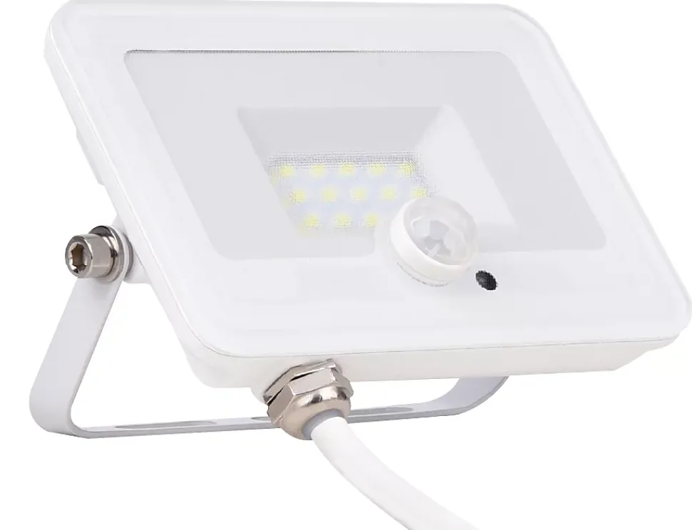 Projecteur plat + détecteur de mouvement. Couleur(s) : blanc. Matériau : aluminium. Puissance : 10/20/30/50W. Intensité lumineuse : 5000/3000/2000/1000 lm. Température de couleur : 6500K. Indice de protection : IP65Dimensions : 10W : 13.4 x 4.1 x 9 cm, 20W : 16.3 x 11.7 x 4.4 cm, 30W : 19.5 x 14.2 x 4.5 cm, 50W : 23.6 x 16.5 x 4.8 cm