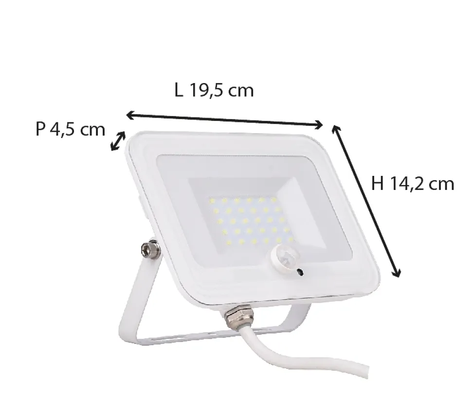 Projecteur plat + détecteur de mouvement. Couleur(s) : blanc. Classe énergétique : A+. Matériau : aluminium. Puissance : 10/20/30/50W. Intensité lumineuse : 5000/3000/2000/1000 lm. Température de couleur : 6500K. Indice de protection : IP65Dimensions : 10W : 13.4 x 4.1 x 9 cm, 20W : 16.3 x 11.7 x 4.4 cm, 30W : 19.5 x 14.2 x 4.5 cm, 50W : 23.6 x 16.5 x 4.8 cm