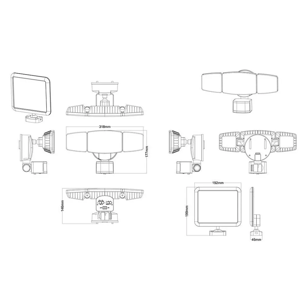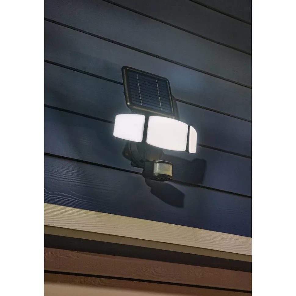 Spot à énergie solaire avec détecteur de présence et panneau solaire déporté – 3 têtes très éclairantes. Puissance panneau solaire : 2,5 W. Nombre de Lumens : 1000. Durée d’illumination réglable : 30″ – 60″ – 120″. Distance de détection : 10 m max. Interrupteur ON / OFF / AUTO. 5 m de câble entre le panneau solaire et le spot.