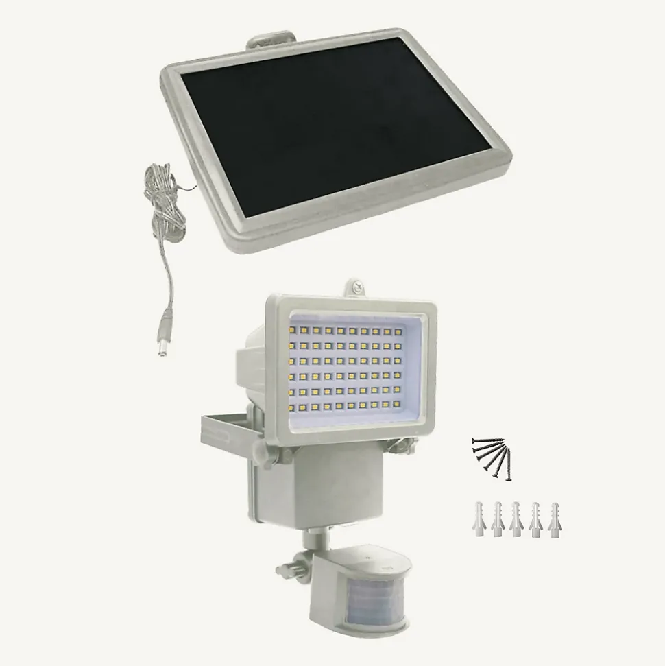 Très éclairant ! Ce projecteur Denver solaire blanc à détection de mouvement de qualité professionelle, va vous permettre d’éclairer votre garage ou votre extérieur !• Couleur de la lumière : Blanc• Couleur du produit : Blanc• Nombre de lumens : 1000• Nombre de LED : 60• Dimensions : H17cm L13cm• Alimentation : solaire, 1 Batterie AA 1000mAh 6V Ni-Mh (inclue)• Matière : Aluminium• Garantie : 2 ansUsage et Installations : Ce projecteur blanc de qualité professionnelle, fonctionne avec un panneau solaire déporté, ce qui vous permet de placer le projecteur à l’intérieur de votre garage et le panneau à l’extérieur (câble d’alimentation de 1,8m). Le projecteur est autonome, il s’allume avec la détection de mouvement lorque la nuit tombe. 100 % étanche, l’indice IP44 vous garantit sa protection quelque soit la météo.Données techniques : Le projecteur est composé de 60 LED SMD, à durée de vie très longue. Il propose 3 fonctions ; 30, 60 ou 120 secondes d’allumage. Une marche forcée (mode 1) est également disponible vous permettant un éclairage en continu. Le boîtier marche – arrêt – auto est protégé. Le détecteur de mouvements est également orientable en hauteur (ne se déclenche pas au passage d’un animal). Les accessoires de visseries sont fournis. 3 points de fixation pour faciliter son installation.Source lumineuse : Ce projecteur de 1000 lumens avec une portée de 12 mètres sur 180 degrés.Option : Le projecteur existe également en noir.