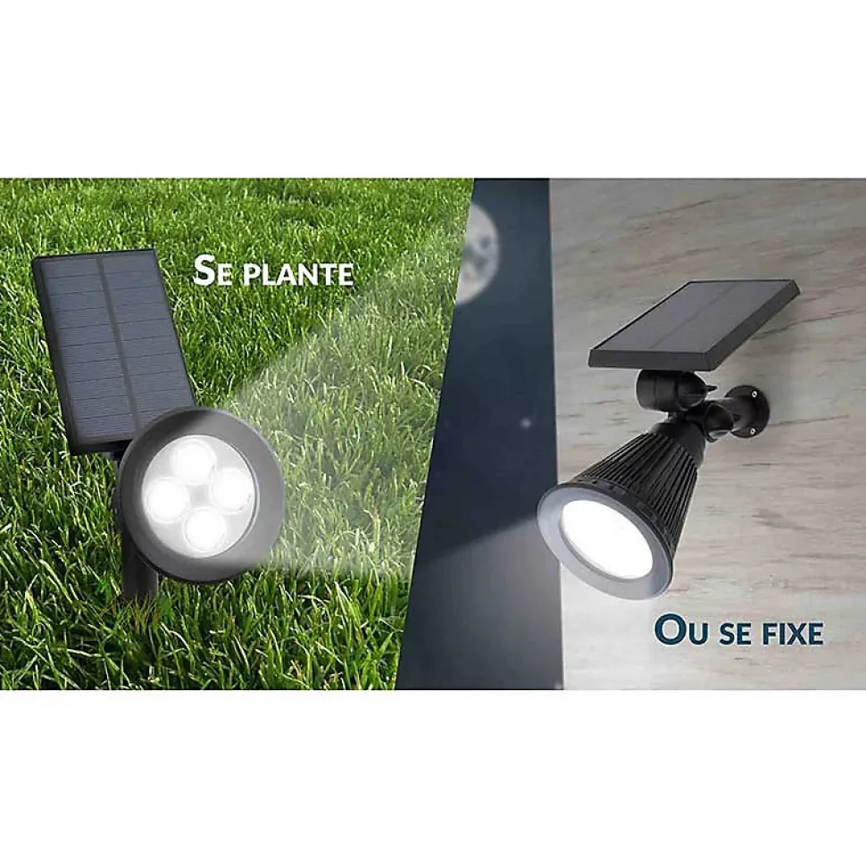 - Le projecteur est muni d’un panneau solaire orientable (tête pivotante à 90°C) et d’un accessoire >. Ainsi, ces derniers vous laissent le choix de l’inclinaison et de la place la plus appropriée à la réception d’énergie solaire. En effet le choix de le fixer à un mur ou de le planter dans votre jardin vous reviendra.