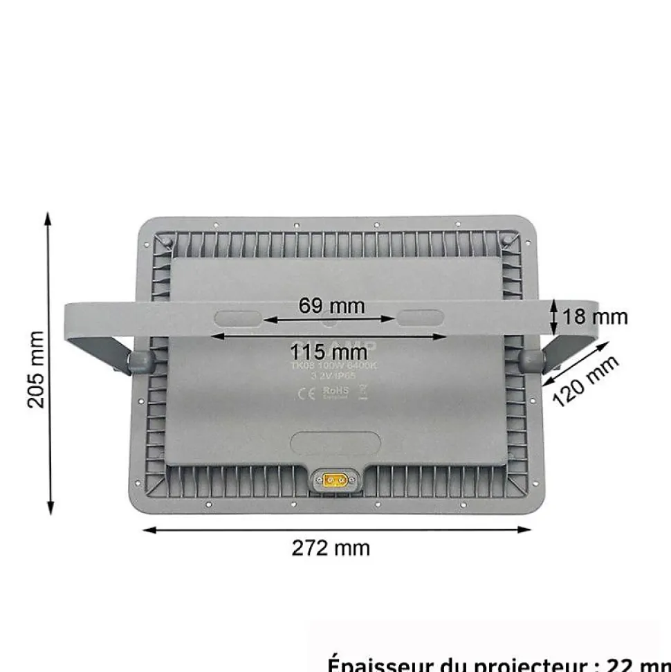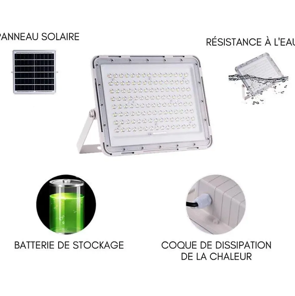 - [Projecteur Solaire LED 100W IP65 (Panneau Solaire + Télécommande Inclus)] Découvrez le Projecteur Solaire LED 100W IP65 (Panneau Solaire + Télécommande Inclus) qui permet d’éclairer vos espaces extérieurs.[Un projecteur autonome] Ce projecteur solaire est un éclairage particulièrement pratique car il n’a pas besoin d’être branché sur secteur. Sa batterie se charge en journée grâce à son panneau solaire photovoltaïque en convertissant la lumière du soleil pour créer un éclairage renouvelable. C’est donc une solution d’éclairage économique ! Sa durée de charge est d’environ 5 à 8h, cela variant selon du temps et l’exposition du panneau.[Contrôle à distance] Accompagné d’une télécommande, vous pouvez contrôler ce panneau LED solaire à distance, régler sa luminosité et l’intensité d’éclairage selon la charge encore contenue par sa batterie. Il existe également le mode « AUTO » qui permet à la lampe de s’allumer automatiquement dès la nuit tombée grâce au détecteur crépusculaire. [IP65] Son indice de protection IP65 protège le projecteur solaire des intempéries et de la poussière, ce qui le rend parfaitement adapté à une installation dans un jardin.[Installation] Pensez à installer votre projecteur sur une surface plane et stable. Placez le panneau solaire en direction du sud dans une zone lumineuse où un maximum de rayons de soleil peuvent être captés. Il est d’ailleurs conseillé de charger le projecteur pendant 24 heures avant la première utilisation. Branchez le câble du panneau à celui du projecteur.